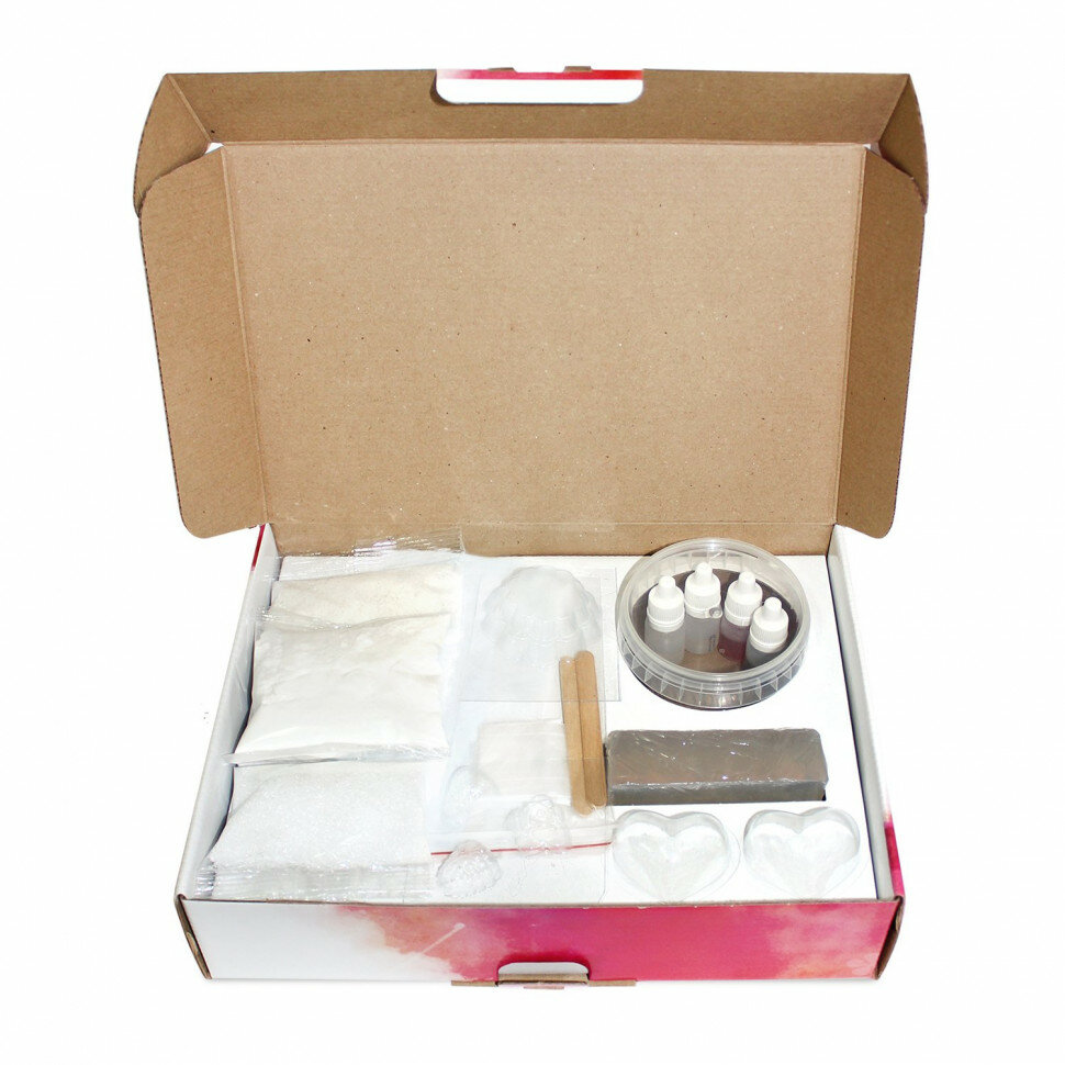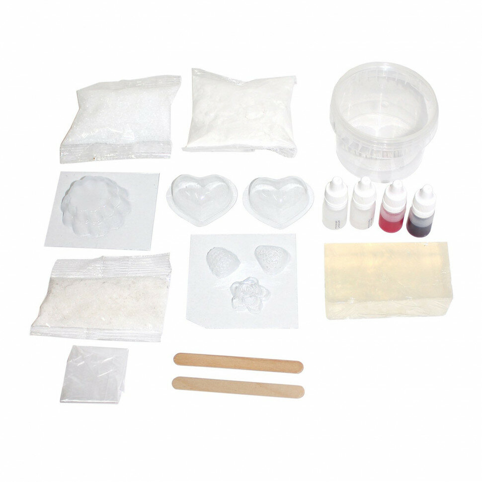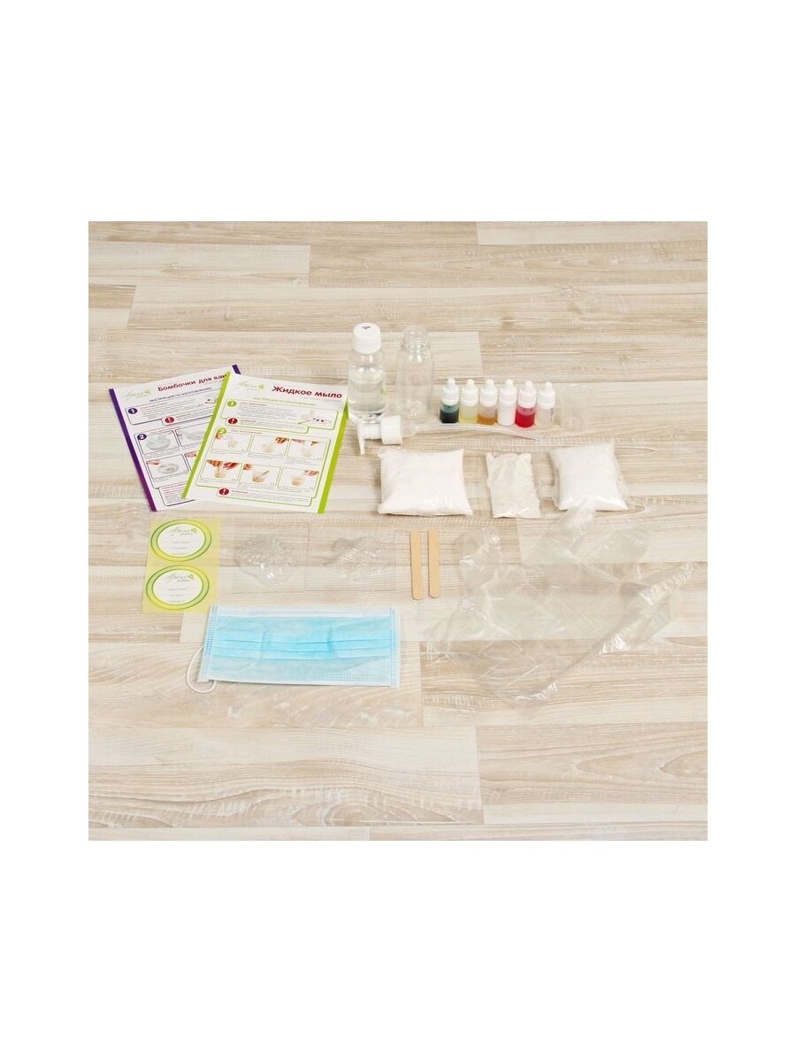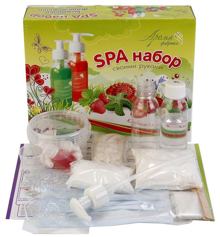 | Состав набора | натуральная морская соль,лимонная кислота,пищевая сода,мыльная основа,натуральный экстракт череды,отдушки (клубника, зелёный чай),пищевые красители (красный, зеленый),замутнитель,формочки (2 шт),флаконы (2 шт х 100 мл),дозатор,ёмкость для перемешивания,стакан мерный,защитная маска,палочки для перемешивания,перчатки,наклейки,инструкция |