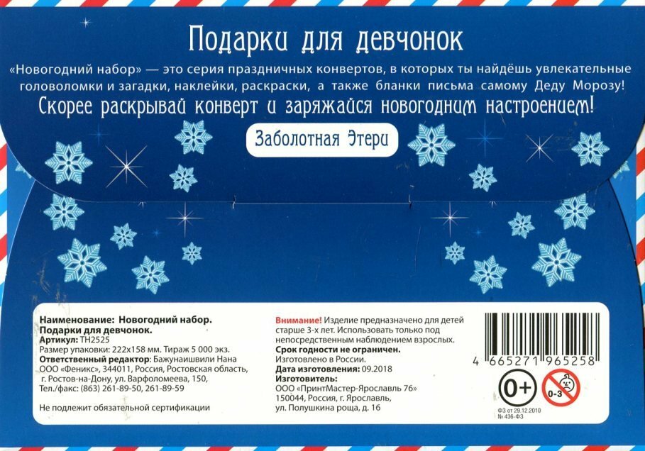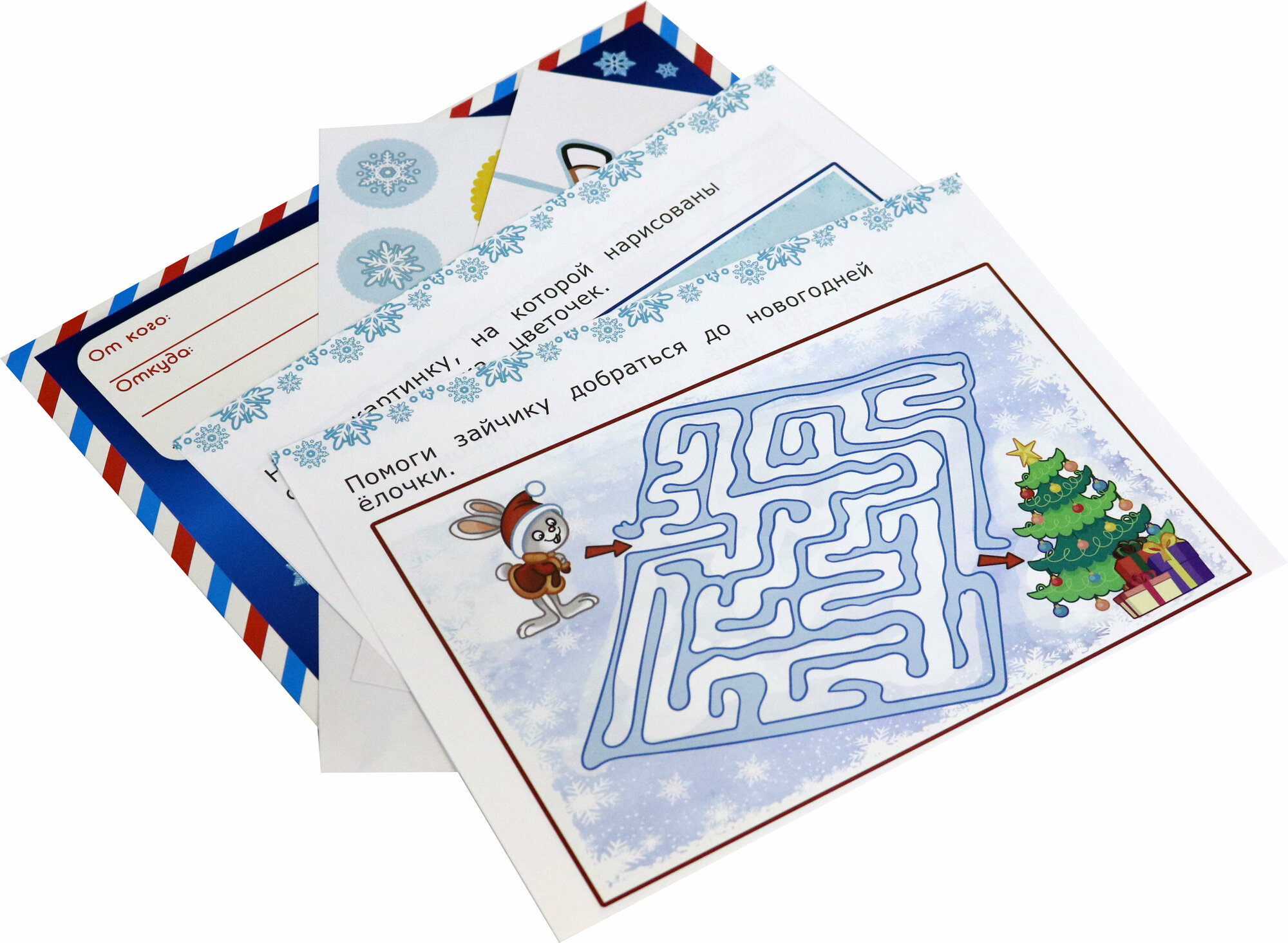 "Новогодний набор" - это серия праздничных конвертов, в которых ты найдешь увлекательные головоломки и загадки, наклейки, раскраски, а также бланки письма самому Деду Морозу!