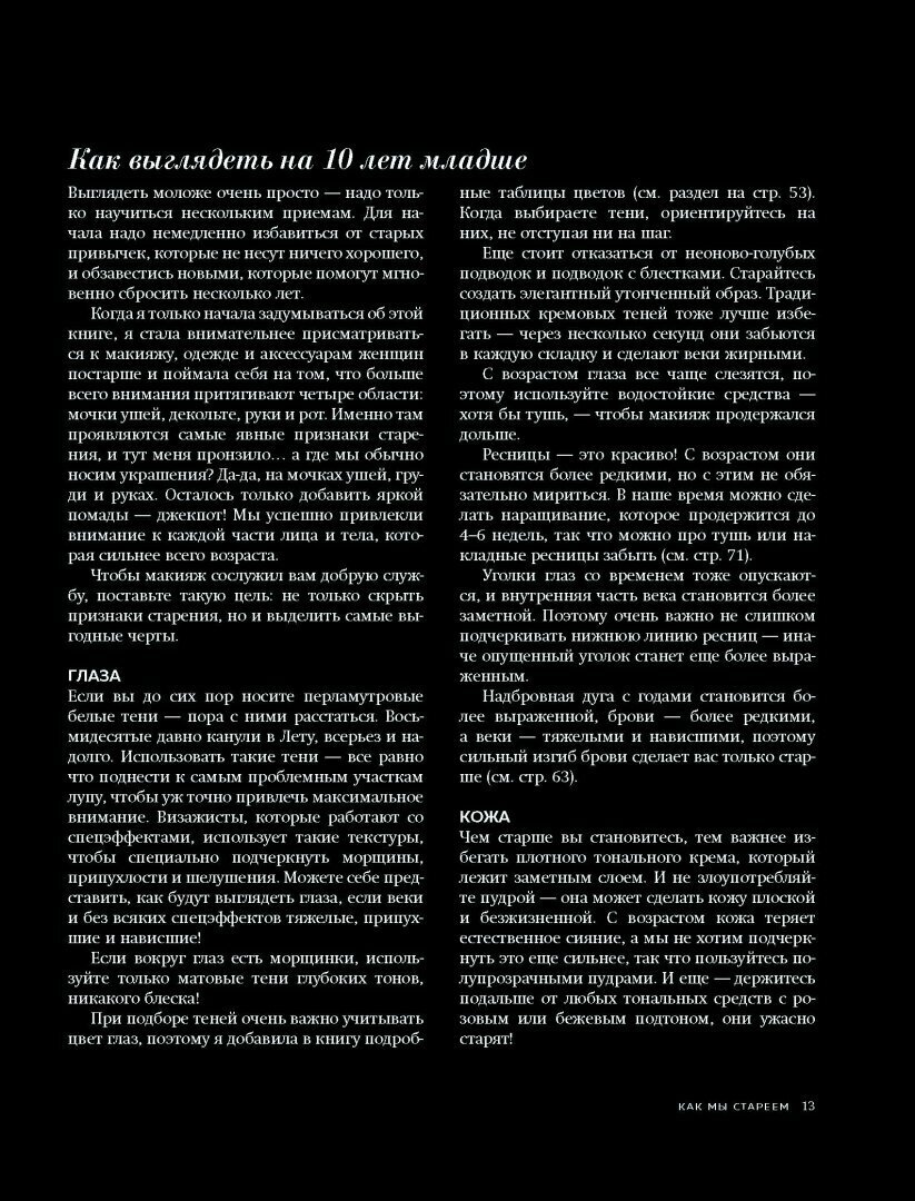 «Макияж» – книга крайне информативная, без «воды» и лишних отступлений. Есть ответы на все те вопросы, которые задают женщины в возрасте – как ухаживать за постаревшей кожей лица, какие средства нужны для грамотного образа и как с помощью косметики сделать себя на несколько лет моложе. Также отмечу яркие и подробные иллюстрации, они очень помогают, когда пытаешься воссоздать образ из книги на своем лице.