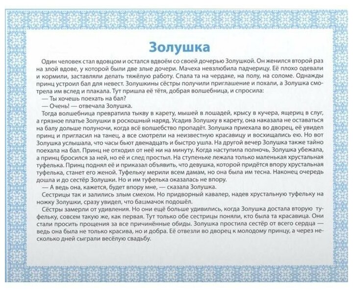 При заказе сильно переживала за язык пересказа, но в целом написано неплохо. Конечно, до оригинального изложения далеко, но и невозможно уместить на одной страничке всю сказку. Приятной неожиданностью стало то, что даже вытащив пазлы, вы остаетесь с симпатичной книжкой с картинками, т.к. картинка продублирована на основе страницы. Ребенок на столе собирает пазл, при этом есть возможность сверить с картинкой в книге. -