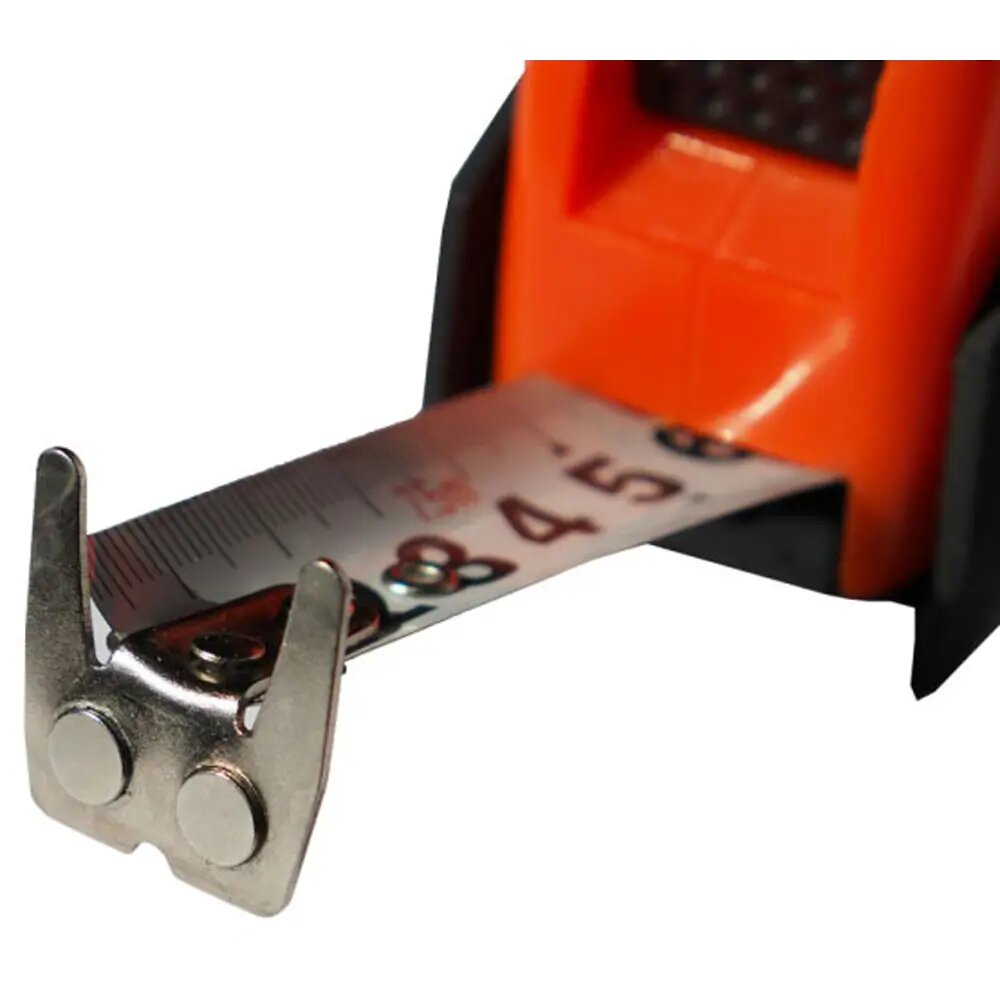 Рулетка имеет двухстороннюю шкалу с крупным шрифтом и белый фон, которые обеспечивают хорошую читаемость шкалы. Двойной зацеп, оснащенный мощным магнитом позволяет производить измерительные работы без посторонней помощи. Полотно изготовлено из качественной стали и имеет увеличенную стойкость к излому. Обрезиненный корпус защищает рулетку от повреждений и обеспечивает надежный захват. Механизм сматывания усовершенствованной конструкции. В выдвинутом положении полотно удерживается автоматически.