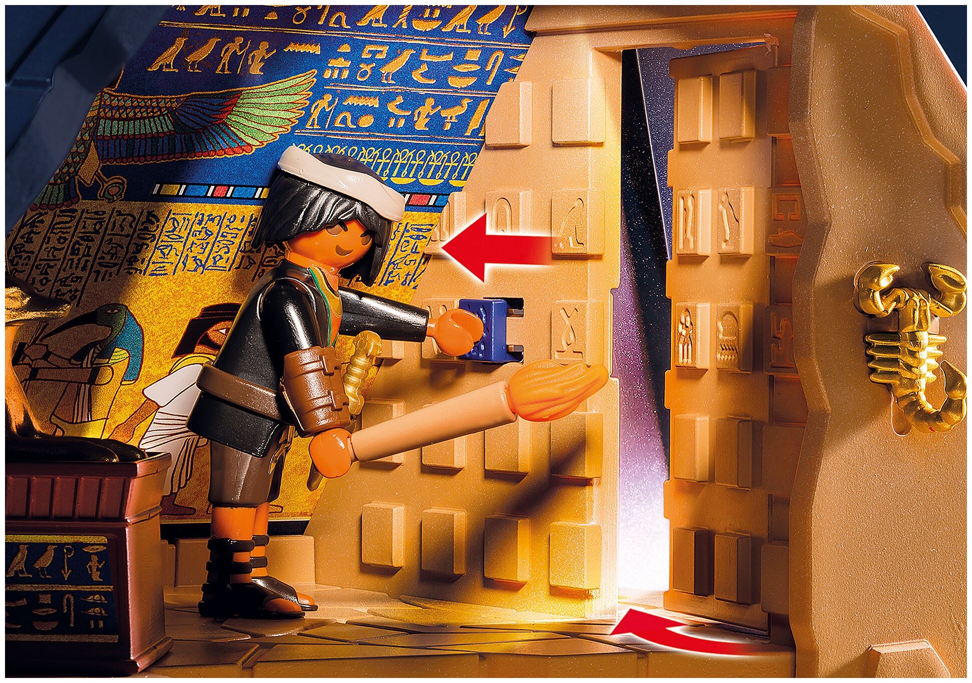 По пирамиде расставлены различные элементы, символизирующие Египетскую культуру. Это статуя Анубиса, амфоры, копья, кинжалы и многое другое. За счет такого разнообразия аксессуаров ребенок не сможет оторваться от игры и будет к ней возвращаться вновь.
