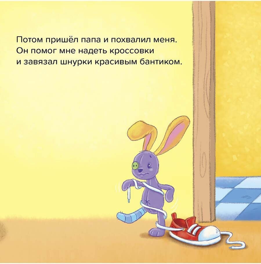Зайка Стёпа решил одеться сам. Футболка, штанишки… кофточка… ох, эти петли и пуговицы! А кроссовки! Хорошо, что папа рядом, - со шнурками зайке точно не справиться. Так чем же закончилось одевание? Давай откроем книжку и всё узнаем…