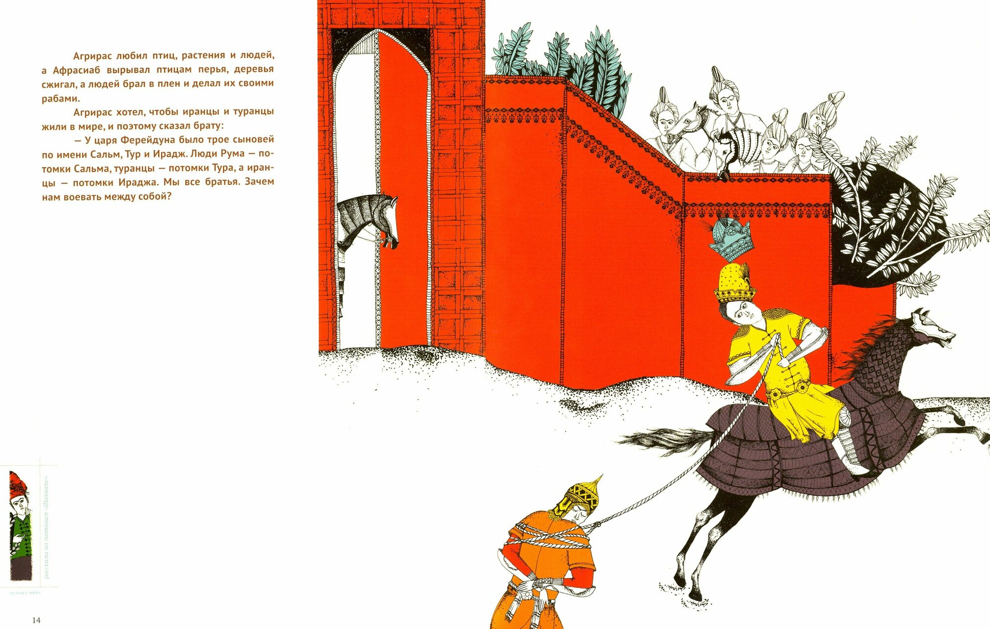 Было это в далекие времена, когда миром правил царь Ферейдун. При нем прекратились войны и на земле воцарился мир. Он справедливо правил всеми частями света, а помогала ему в этом белая птица Сепиде, хранительница царей. И было у Ферейдуна три сына, звали их Сальм, Тур и Ирадж.