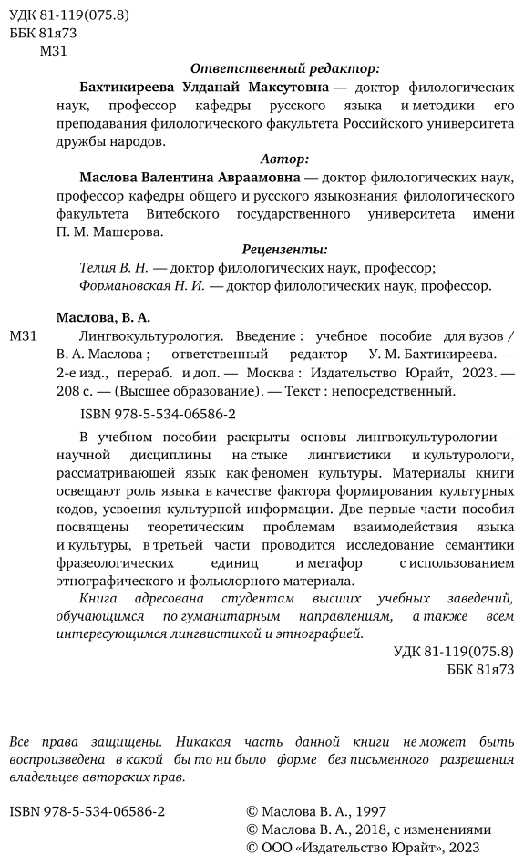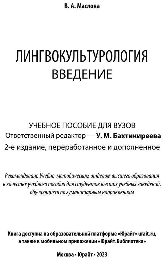 Лингвокультурология. Введение. Учебное пособие для бакалавриата и магистратуры (Маслова Валентина Авраамовна; Бахтикиреева Улданай Максутовна); ЮРАЙТ, 2019