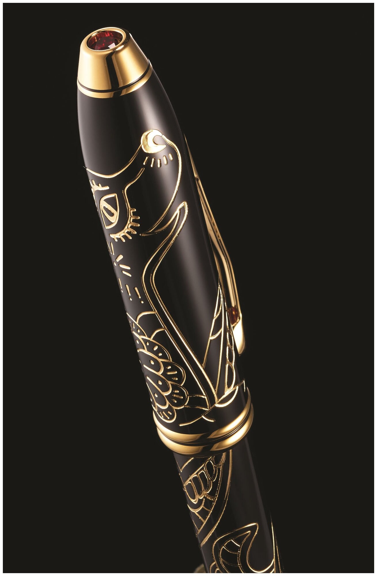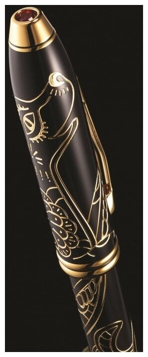 Корпус: ювелирная латунь. Механизм: поворотного действия. Система заправки: заменяемые стержни Cross для шариковых ручек. Размеры ручки: длина -146,0 мм, максимальная ширина (диаметр) - 10,2 мм. Вес ручки : 30 гр. Отделка : многослойное покрытие высококачественным лаком радикально чёрного цвета, оригинальная гравировка с заполнением золотом в виде петуха, отдельные элементы дизайна - позолота 23Kt. (with 23k gold plated appointments), навершие колпачка украшено кристаллом Сваровски (Swarovski® crystal.) с бриллиантовой огранкой. Цвет: лаковый черный. Особенности: специальное издание посвященное 2018 году - году Собаки по восточному гороскопу. поставляется в специальной подарочной упаковке с оригинальным буклетом на тему китайского гороскопа и знакам зодиака. красный кристалл Swarovski® на коническом торце ручки. Модель Cross Townsend 2018 Year of the Dog Special Edition Black Lacquer GT это специальный выпуск ручек посвящён десятому знаку зодиака по китайскому календарю - Петуху. Компания Cross создала свой очередной шедевр, посвященный китайским знакам зодиака. На этот раз специальные ручки выпущены в составе коллекции Cross Townsend - самой престижной коллекции Cross до недавнего времени. Модель Cross Townsend 2018 Year of the Dog Special Edition Black Lacquer GT изготовлена из ювелирной латуни и покрыта глянцевым лаком радикально чёрного цвета. На корпусе с помощью глубокой гравировки выполнен рисунок в виде Собаки, который заполнен позолотой 23 Ct. Остальные детали дизайна также покрыты золотом. Перьевая ручка оснащается пером из чистого 18-каратного золота, а колпачок ручки украшает кристалл Сваровски уникального красного цвета с бриллиантовой огранкой. Ручка поставляется в специальной тематической подарочной коробке, в комплекте также идет оригинальная подставка-пьедестал для размещения ручки и тематический буклет посвященный китайским знакам зодиака.
