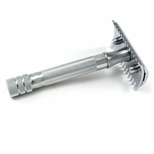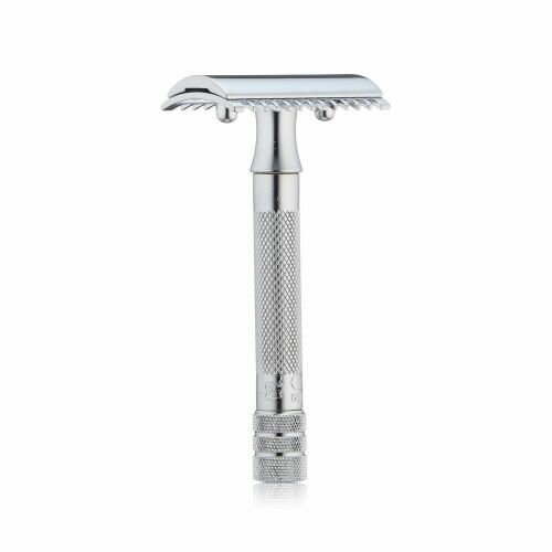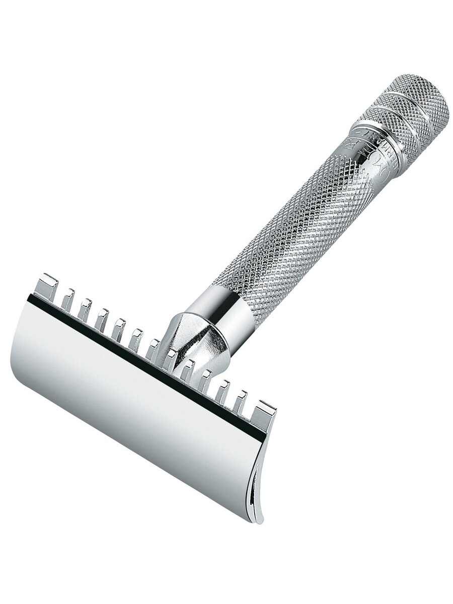 Т-образный станок для бритья Merkur 9015001 из высококачественной хромированной стали с открытым гребнем. Кромка лезвия выступает чуть сильнее, чем в станках с закрытым гребнем, что обеспечивает более плотный контакт лезвия с кожей и обеспечивает более чистое и гладкое бритье. Бритва идеально подойдет для тех, у кого более густая щетина, либо длинная густая борода. Рукоятка станка укороченная и легкая.