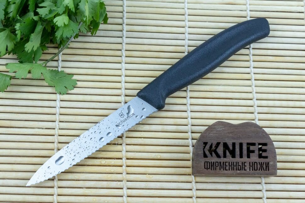Маленький нож с серрейторной заточкой для очистки овощей и фруктов, шпиговки мяса, нарезки чеснока и свежей зелени, фигурной резки теста, резки на мелкие куски, украшения и оформления блюд, а также для других работ, требующих точной резки.