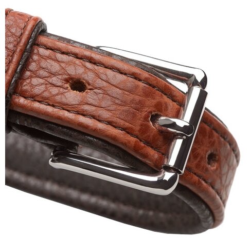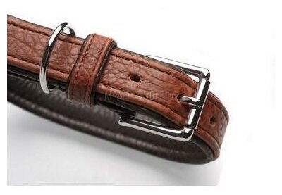 Ошейник из натуральной кожи бизона для собак. Благодаря уникальной текстуре кожи каждого кусочка кожи - каждое изделие уникально. Выполнен из двух слоев кожи с подвернутыми краями, что препятствует вытиранию шерсти в процессе использования. Между слоями проложена прочная пластиковая сетка, которая придает ошейнику дополнительную прочность и препятствует вытягиванию ошейника. Ошейник украшен стильной фурнитурой и брелоком. Обхват шеи: 33-39 смШирина: 2.8 см
