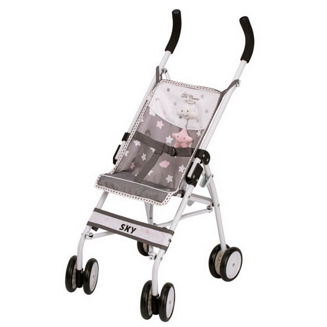 Коляска для кукол с чехлом, розовая, DeCuevas серия: Sky Великолепная дизайнерская коляска-трость DeCuevas Sky идеально подходит для кукол фирмы Munecas Antonio Juan. Серия колясок Скай выполнена из текстиля модных серых тонов с белой и розовой отделкой, украшена шелкографией из звезд, кружевами и милыми элементами в виде мягких игрушек. Коляска легко складывается и в сложенном виде занимает совсем не много места. Коляска DeCuevas имеет ремни безопасности, которые спасут куклу от случайного падения.