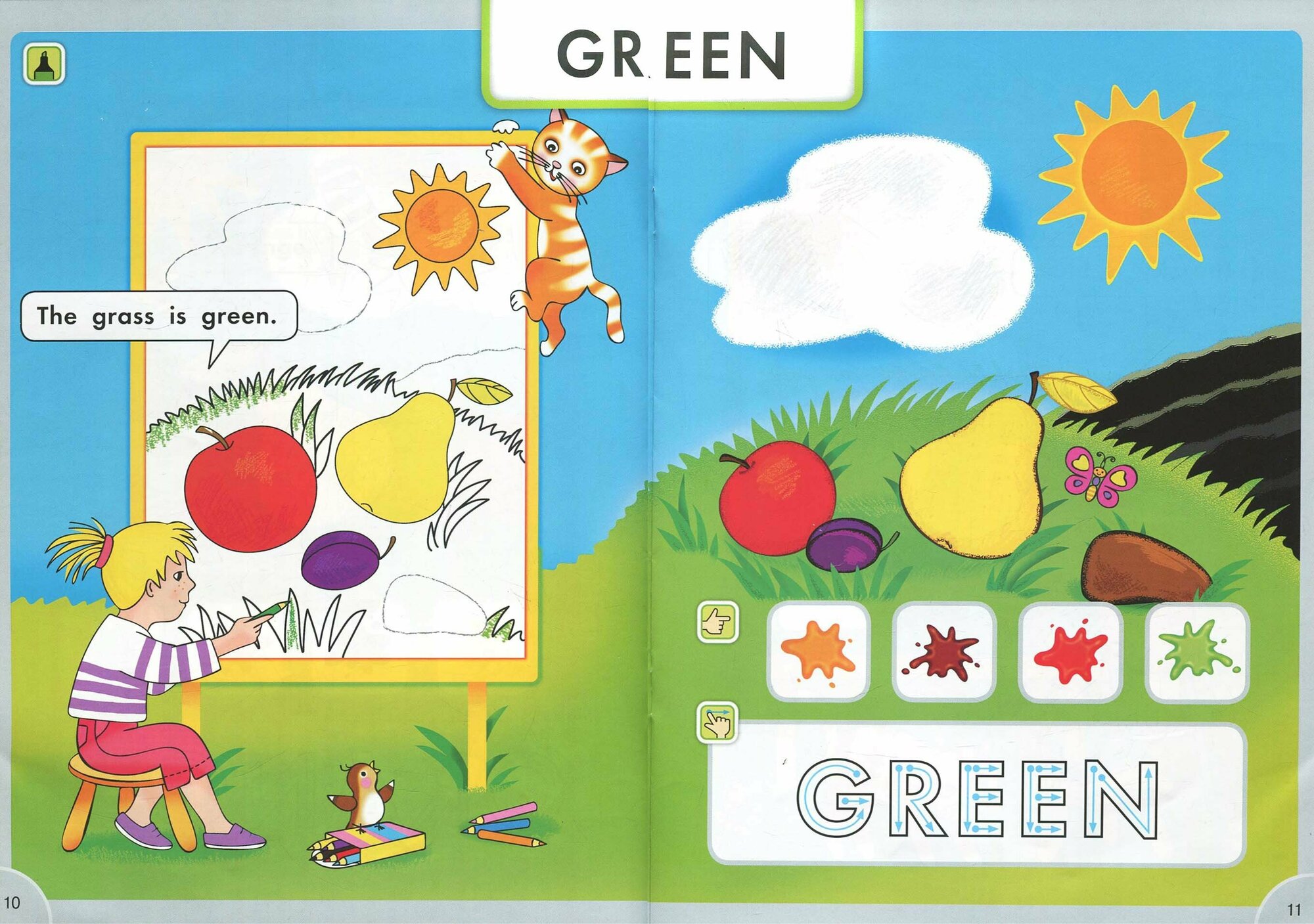 Из книги "Colours" ребенок узнает, как называются по-английски цвета, и увидит, как девочка рисует картину.