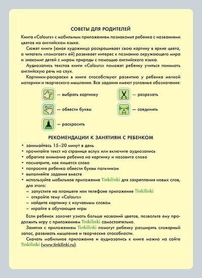 Купила книгу для дочки 5л в дополнение к занятиям по английскому языку. Книга формата А4, печать хорошего качества, картинки приятные. В книге представлены 9 основных цветов и простейшие предложения про них. На каждом развороте представлен материал про один цвет, предлагается ребенку раскрасить картинку. Страницы мелованные, из-за этого раскрашивать неудобно. Дочка раскрашивала карандашами, получилось бледно. В конце книги есть вырезная картинка.