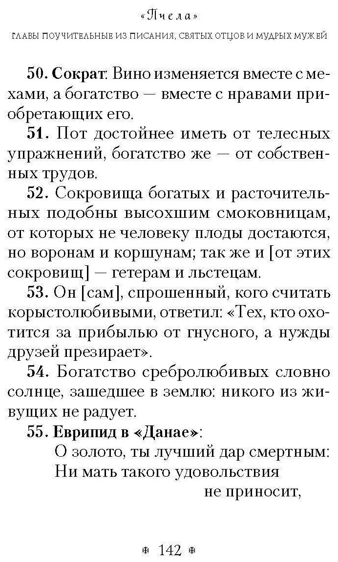 Сборник мудрых изречений "Пчела" был очень популярен в Византии и в Древней Руси. Он содержит подобранные неизвестным древним автором (возможно, IX-X веков) цитаты из Священного Писания, отцов Церкви и церковных писателей (до VII века включительно), античных дохристианских авторов (известных исторических деятелей античности, поэтов, философов, историков) или поучительные фрагменты из их жизнеописаний. Изречения собраны в тематические главы (71 глава) на самые различные мировоззренческие и даже житейские темы, и произведение, таким образом, представляет собой краткую нравственно-назидательную "энциклопедию", не теряющую своей актуальности и по сей день.