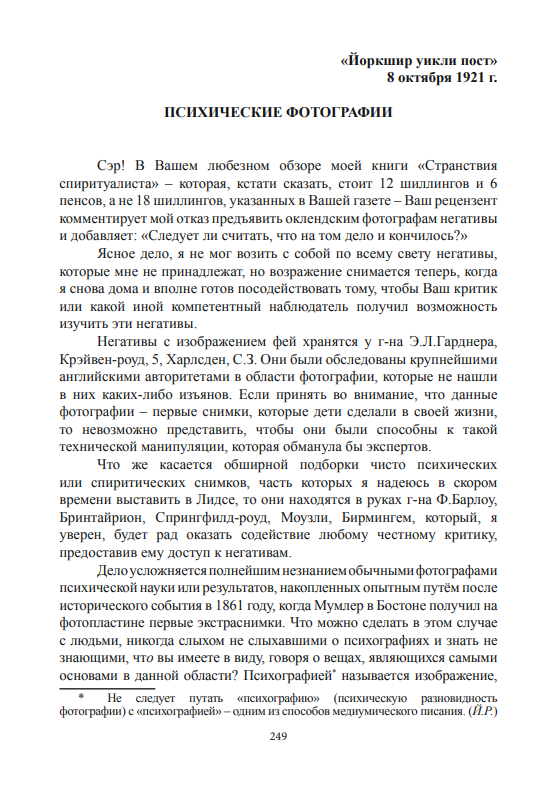 Сэр Артур Конан-Дойль впервые публично заявил о своей вере в общение с умершими в статье, которая появилась в журнале «Light» от 21 октября 1916 года. Это заявление для многих прозвучало тогда как гром среди ясного неба. Но первый спиритический сеанс, на котором он присутствовал – надо сказать, с сильно скептичным настроем ума – состоялся в конце 1886 года, когда Конан-Дойль был ещё только начинающим практиковать врачом. Интерес же его к психическим феноменам обозначился за несколько лет до этого первого опыта. Наверное, нет человека, который бы не читал Конан-Дойля, но нет и человека, который бы прочитал всего Конан-Дойля. Это, при всём желании, невозможно даже в Англии.