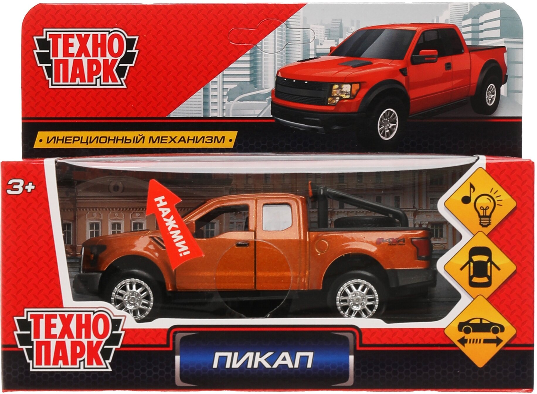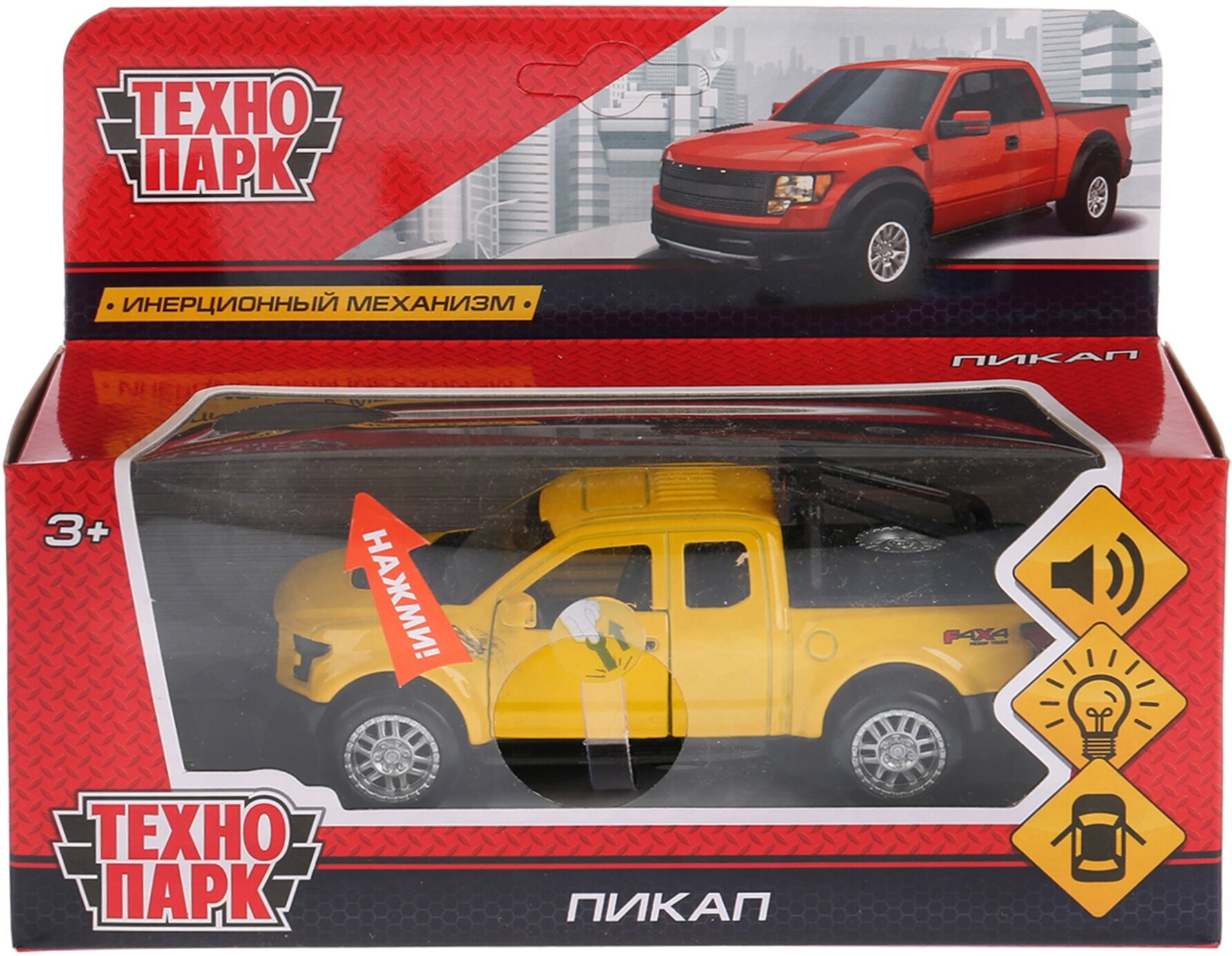Машинка Пикап - это новинка ТМ Технопарк. У неё металлический корпус, выполненный в оранжевом цвете. Оснащена зуковым и световым модулем при нажатии на кнопку загораются лампочки и проигрываются звуки. У машинки открываются двери, можно рассмотреть салон внутри. Оснащена инерционным механизмом если поставить машинку на ровную поверхность, потянуть за корпус и отпустить, то она поедет сама. Развивает мелкую моторику, воображение, расширяет кругозор. Размер 12 см. Рекомендуется детям от 3 лет. Внимание! Товар в ассортименте. Возможности выбора определенного товара нет.