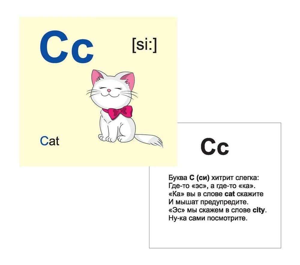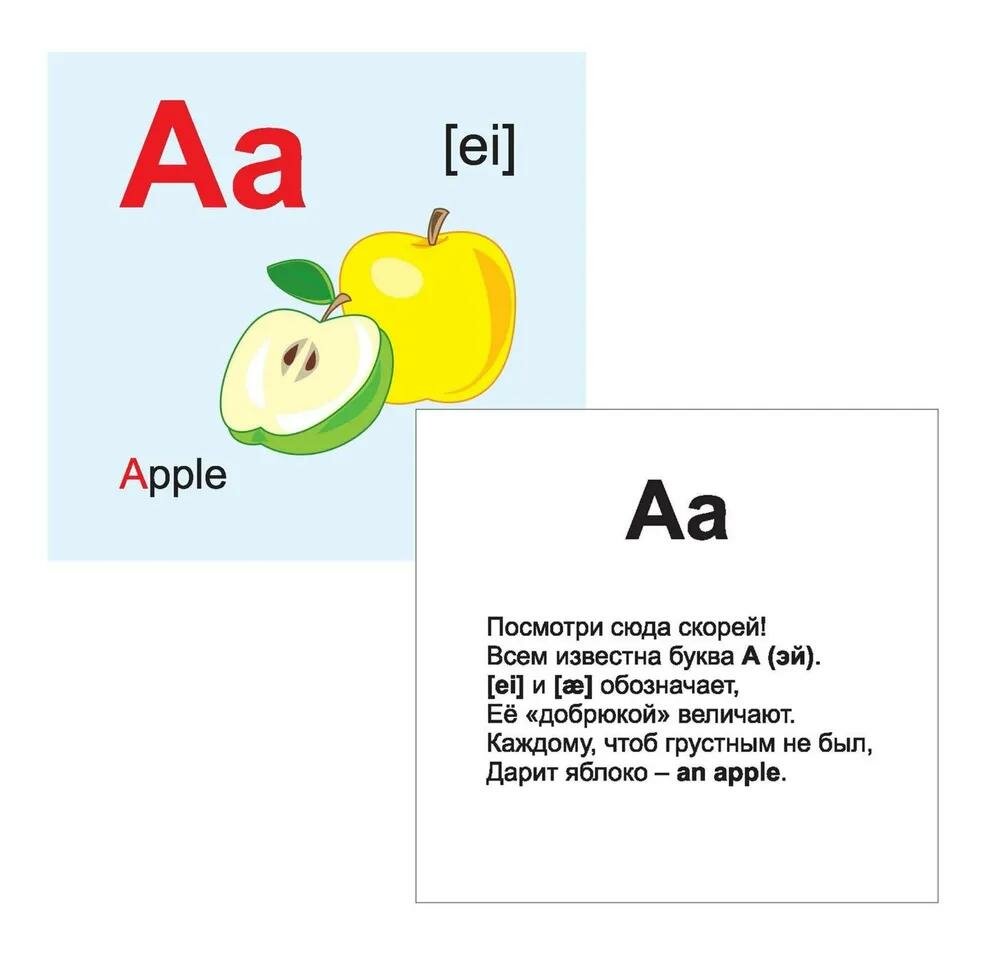 В комплект входит 32 карточки: из них, 26 карточек с буквами английского алфавита, где на лицевой стороне карточки красочное изображение буквы, её транскрипции и слово с картинкой, начинающееся на эту букву, на оборотной стороне - стихотворение, и 6 карточек с правилами чтения гласных букв.