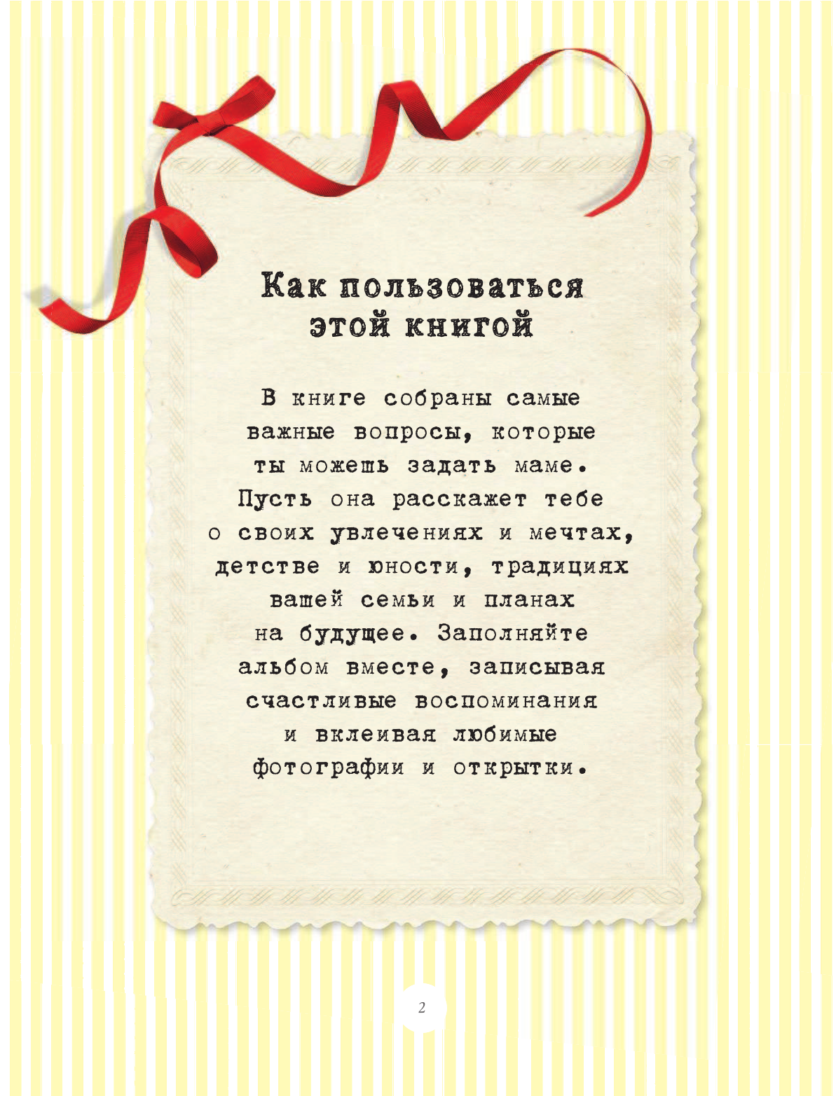 Великолепная книга-анкета, в деле еще не была, куплена на подарок к Новому году. Но промежуточные иллюстрации и вопросы не оставят вас и ваших мам без внимания. Очень понравилось оформление, но оно немного дктское, имейте это в виду. Думаю, будет отличным досугом для семейных вечеров, а также получше узнать друг друга.
