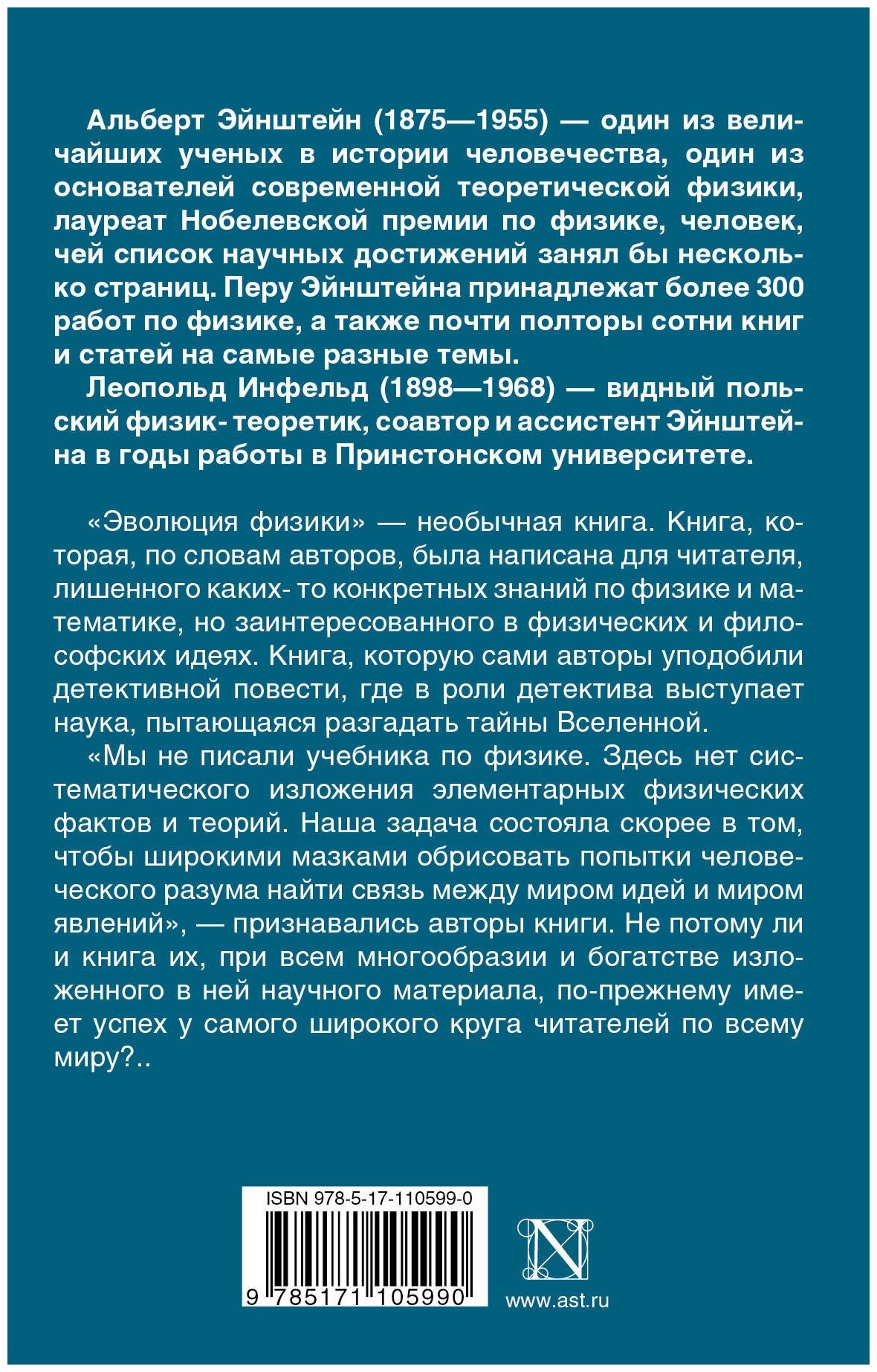 "Эволюция физики" – необычная книга. Книга, которая, по словам авторов, была написана для читателя, лишенного "каких-то конкретных знаний по физике и математике", но "заинтересованного в физических и философских идеях". Книга, которую сами авторы уподобили детективной повести, где в роли детектива выступает наука, пытающаяся разгадать тайны Вселенной.