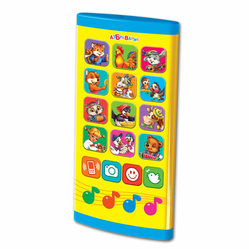 Играть с этим смартфончиком вдвойне интересно – ведь теперь нажимать на звуковые кнопочки можно с двух сторон! 24 песенки ("Радуга-дуга", "Петушок", "Заинька, попляши!", "Идёт коза рогатая", "Ладушки", "Каравай" и другие), 3 сказки ("Теремок", "Маша и медведь", "Заюшкина избушка"), 30 вопросов, загадок, фраз, весёлые игры, танцевальные мелодии ("Енка", "Немецкая полька", "Валенки", "Барыня"), первые знания, телефончик и фотоаппарат - скучать не придётся! Бонус - QR-код для скачивания интерактивной азбуки для смартфона или планшета в приложении «Азбукварик».