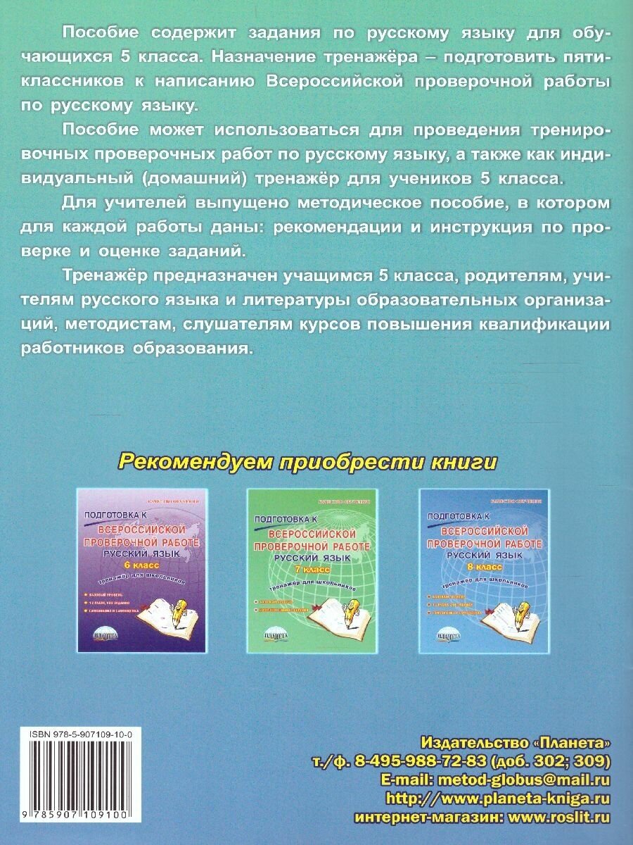 Пособие содержит задания по русскому языку для обучающихся 5 класса. Назначение тренажёра – подготовить пятиклассников к написанию Всероссийской проверочной работы по русскому языку. Пособие может использоваться для проведения тренировочных проверочных работ по русскому языку, а также как индивидуальный (домашний) тренажёр для учеников 5 класса. Для учителей выпущено методическое пособие, в котором для каждой работы даны: рекомендации и инструкция по проверке и оценке заданий. Тренажёр предназначен учащимся 5 класса, родителям, учителям русского языка и литературы образовательных организаций, методистам, слушателям курсов повышения квалификации работников образования.