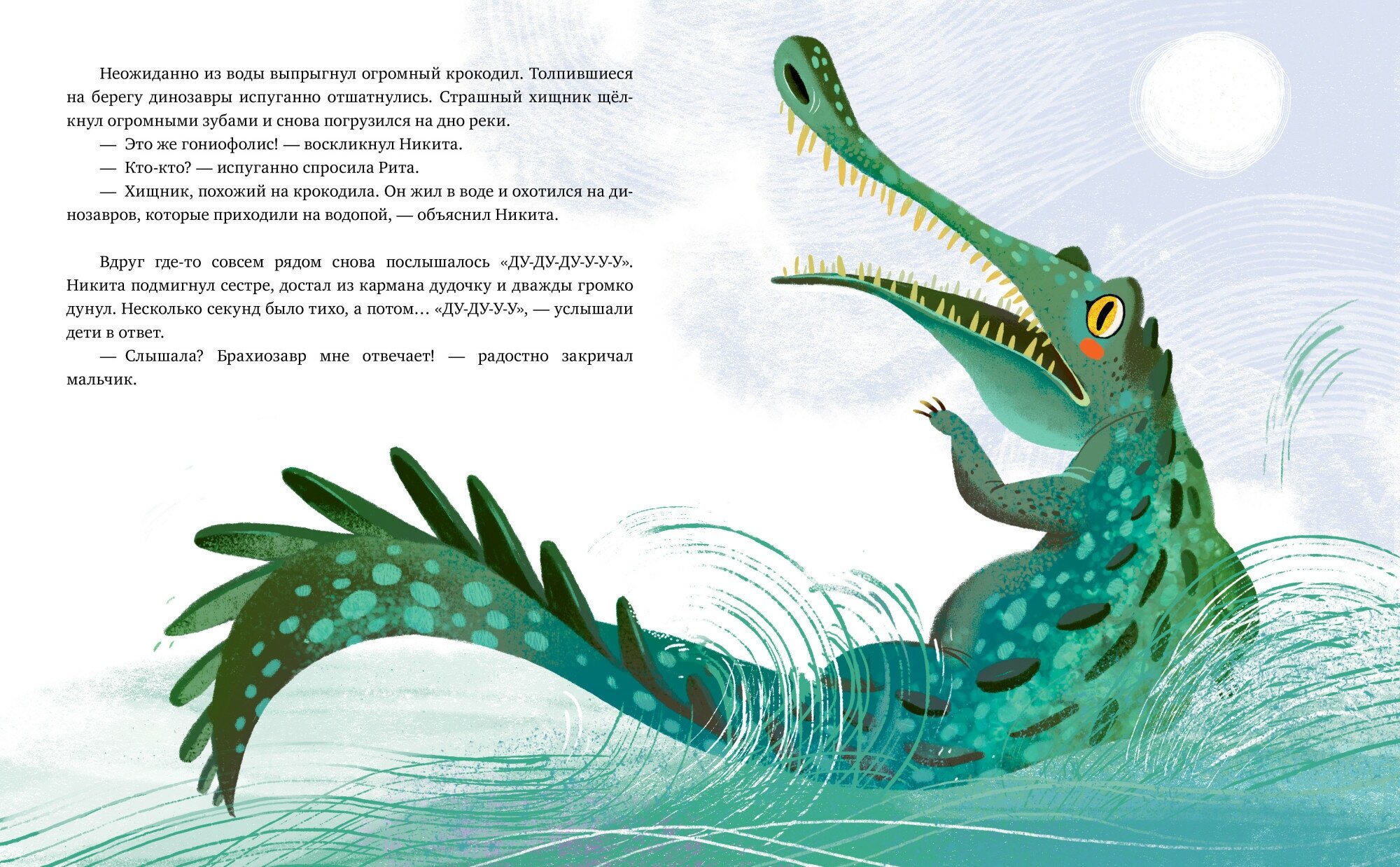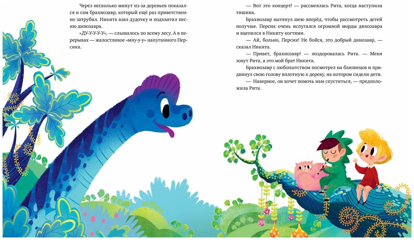 Однажды близнецы Рита и Никита болтали о динозаврах... Как вдруг волшебная книга перенесла их и трусливого кота Персика во времени на 200 миллионов лет назад, в юрский период. Близнецы отправятся в незабываемое и опасное путешествие! Им предстоит своими глазами увидеть свирепого гониофолиса, прокатиться на шее брахиозавра, поиграть с малышом диплодоком. Смогут ли они преодолеть все препятствия и вернуться обратно домой к маме и папе?