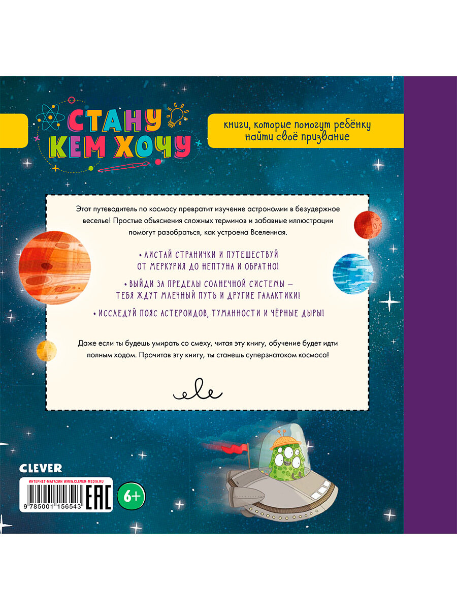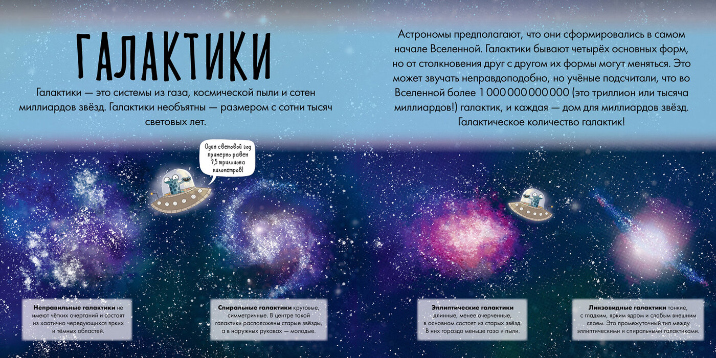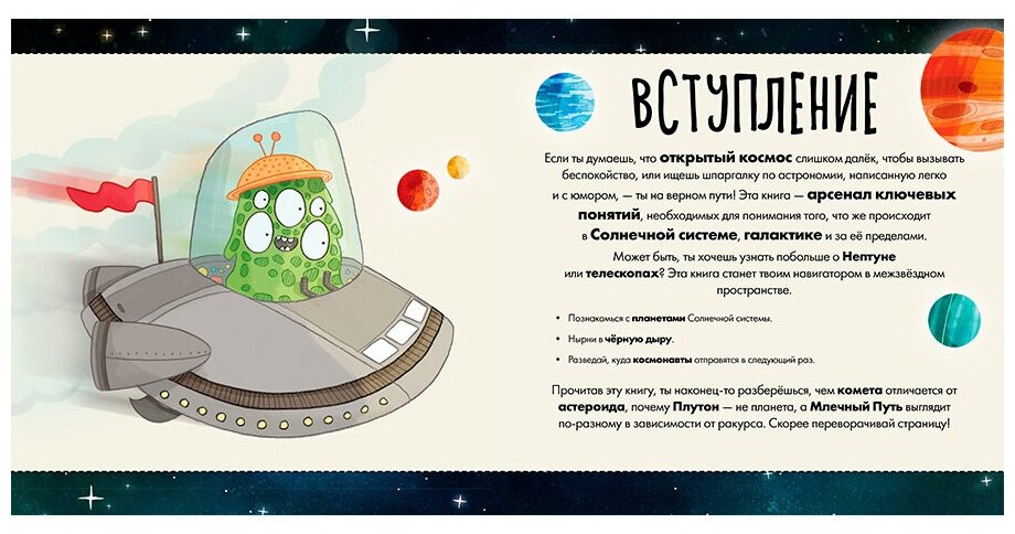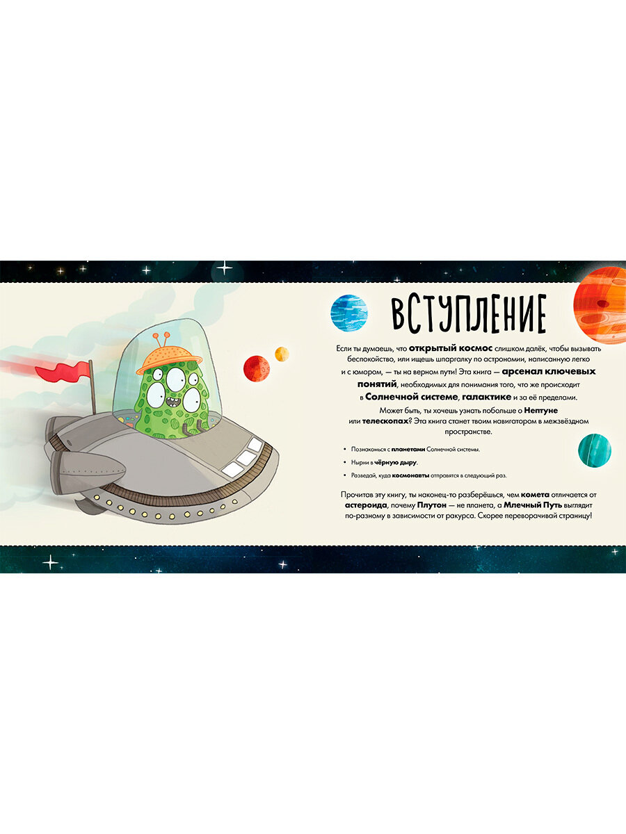 Этот путеводитель по космосу превратит изучение астрономии в безудержное веселье! Простые объяснения сложных терминов и забавные иллюстрации помогут разобраться, как устроена вселенная. Листай странички и путешествуй от Меркурия до Нептуна и обратно, Выйди за пределы солнечной систем - тебя ждут млечный путь и другие галактики, Исследуй пояс астероидов, туманности и чёрные дыры! Даже если ты будешь умирать со смеху, читая эту книгу, обучение будет идти полным ходом. Прочитав эту книгу, ты станешь суперзнатоком космоса!