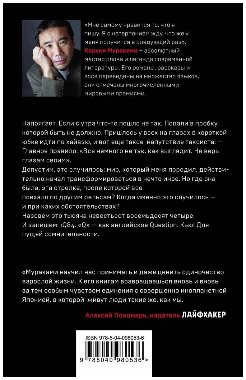деликатно умолчу, дабы создать интригу вокруг ее персоны. Скажу лишь, что ее образ во мне вызывал бурю различных эмоций: от восхищения до отвращения. Не смотря на это, каждый ее поступок мне был по-человечески понятен. Именно ее глазами читатель видит, что мир вокруг героев по каким-то причинам изменился. С детства отличаясь наблюдательностью, Аомамэ чувствует, что происходит что-то необъяснимое и, глядя в звездное небо, понимает, что находится не в привычном мире 1984 года, а в ТЫСЯЧА НЕВЕСТЬСОТ ВОСЕМЬДЕСЯТ ЧЕТВЕРТОМ году. Когда и где произошел ее переход в иной мир, как вернуться назад и, самое главное, по какой причине ее закинуло в мир 1Q84 года - на эти вопросы Аомамэ придется найти ответы.