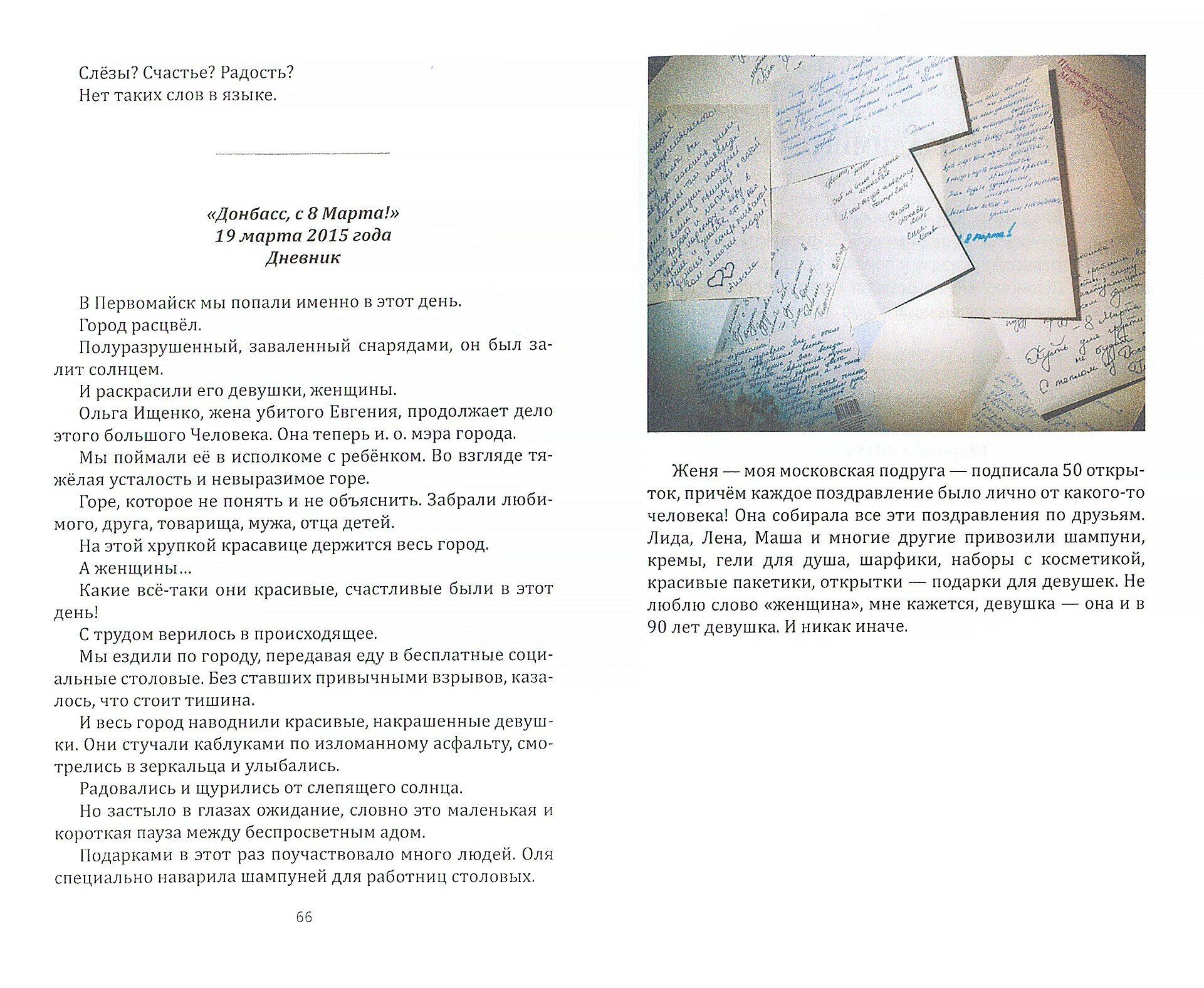 Такие рассказы - самые впечатляющие. За лесом не видно деревьев, за статистикой жертв не видно лиц конкретных людей. И Дунина книга именно об этом - она возвращает им имена и лица, рассказывает о всех этих людях с такой теплотой, с таким интересом, что проникаешься сразу. Тогда, в 2015 году, когда, казалось, врали все, с обеих сторон конфликта, я, читая Дунин блог, часто ловила себя на мысли, что вот ей - верю. Вот эта интонация - она сохранилась и в книге.