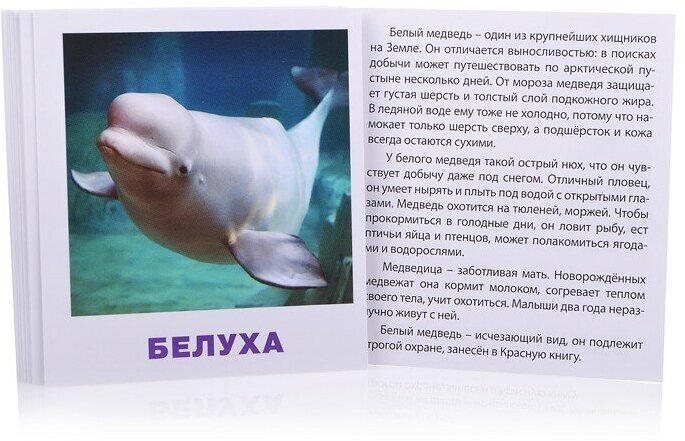 В наборе всего семнадцать карточек с изображением животных и птиц севера. Все основные животные для изучения. Карточки глянцевые с лицевой стороны, картон плотный, сами рисунки интересные, красивые, приятно держать в руках, снизу на каждой карточке подписаны названия животных и птиц, а с обратной стороны - текст с объяснением, очень удобно. Есть задание для родителей.