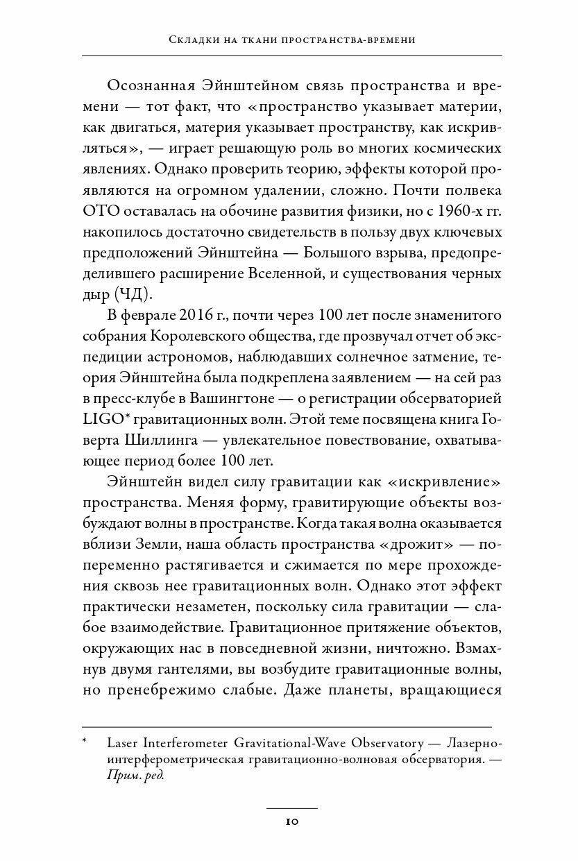 Увлекательная и интересная научно-популярная книга. В ней автор популярным языком объясняет основные фундаментальные закономерности нашей Вселенной и рассказывает об основных теориях. Книга состоит из шестнадцати глав, в которых описываются такие вещи, как теория относительности, гравитация и гравитационные волны, эволюция звёзд и т.д. Также есть приложение и примечания к главам книги. Книга сделана очень качественно, бумага белая офсет, есть чёрно-белые иллюстрации, отсутствуют формулы. Книга очень подойдёт любителям таких наук, как физика, астрономия и космология для углубления знаний.