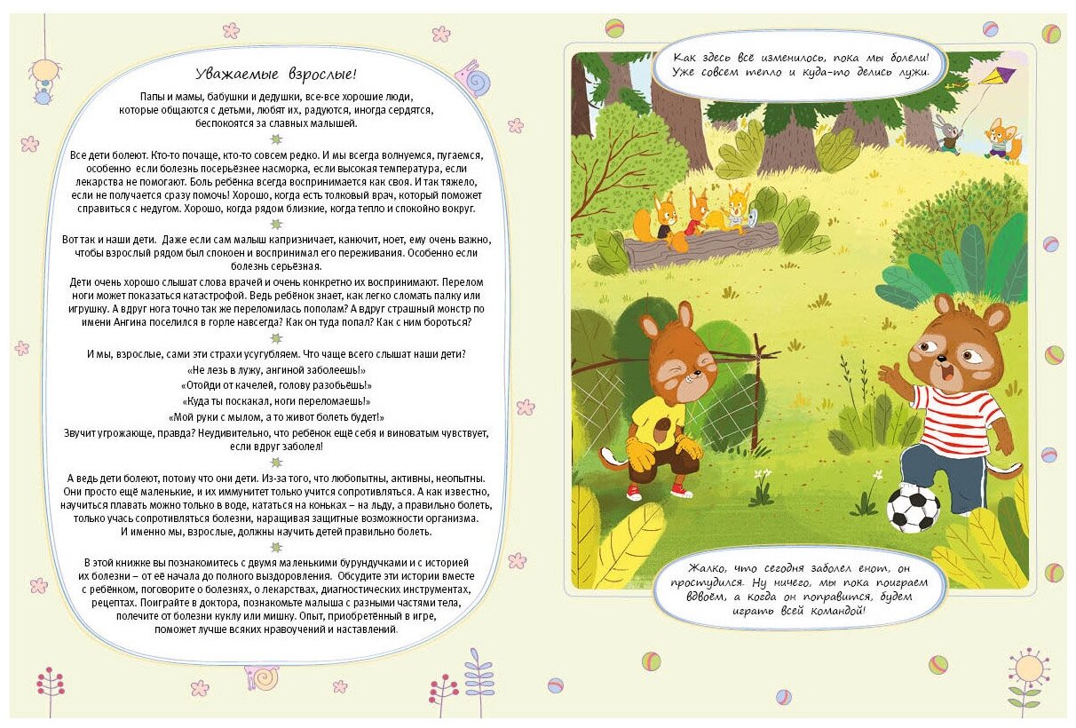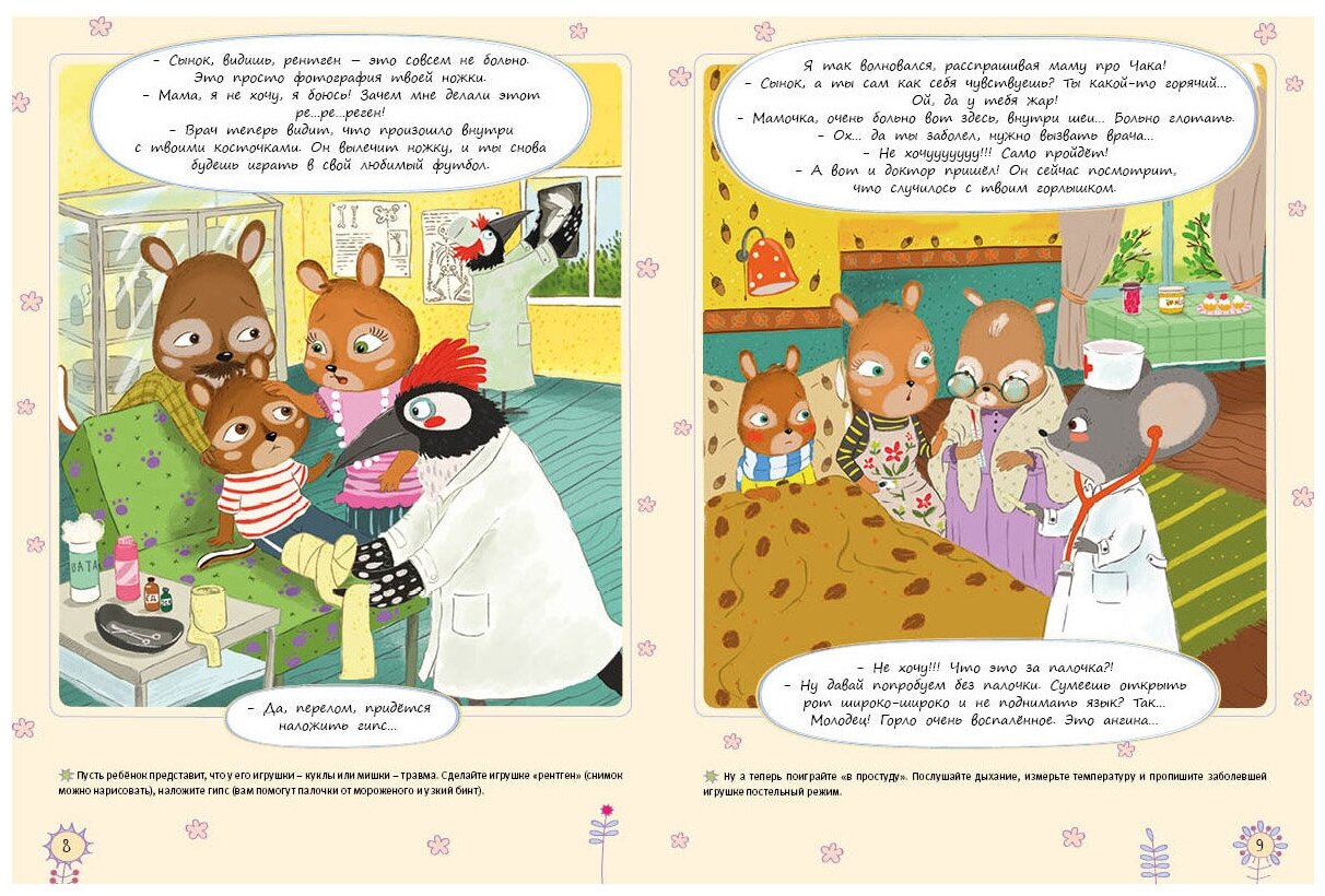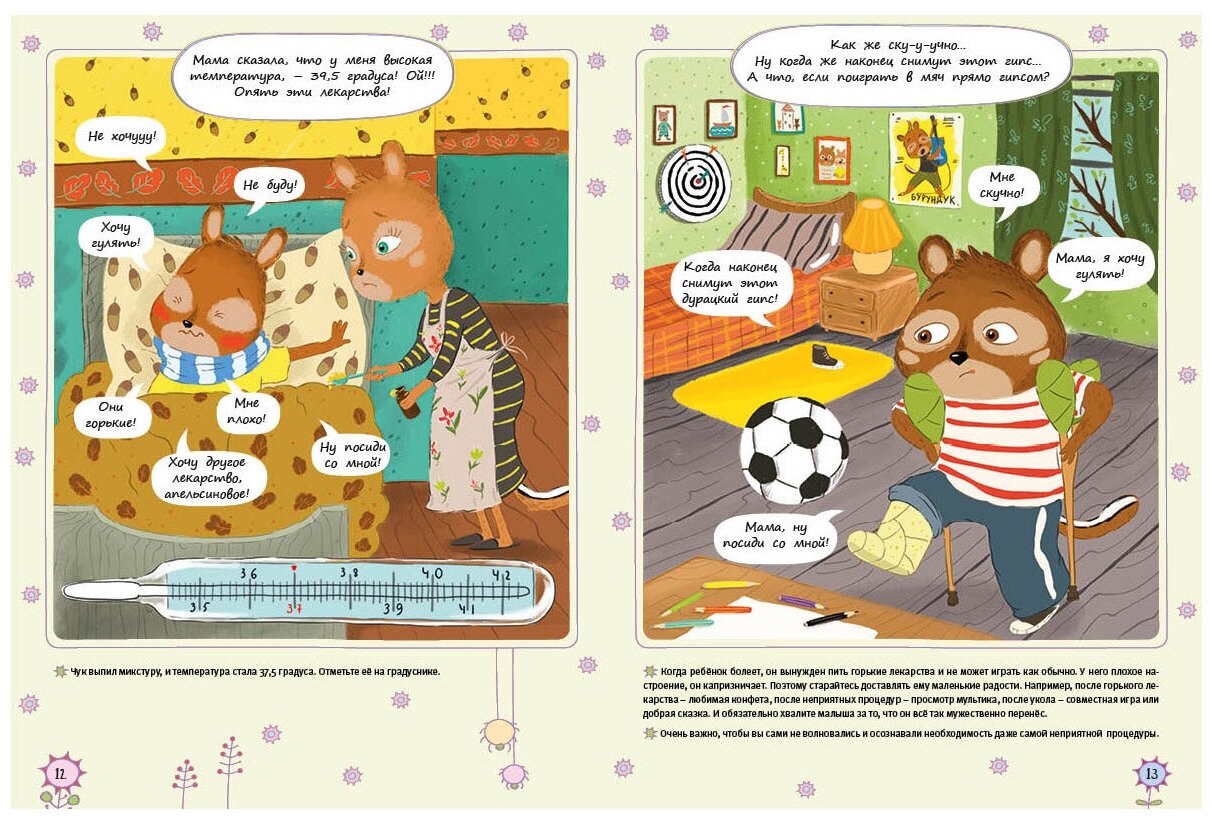 Сыну три с половиной года, и он никогда не хочет лечиться. Каждое ОРВИ превращается в настоящее испытание. Эта книжка его очень заинтересовала. Слушал историю про бурундуков Чака и Чука внимательно и задавал вопросы. Читали не единожды, а много раз, пока все не запомнил) А потом начались бесконечные игры в доктора. Но почему-то медведей своих плюшевых он лечит не Йодом, а Мёдом)))) Книжка нам понравилась. Она снимает страхи перед болячками не только у ребёнка, но и у мамы.