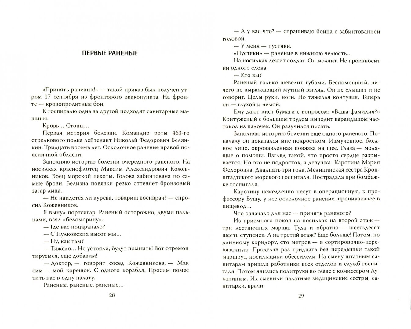 Говоря о раненых, автор книги показывает целую галерею защитников Ленинграда - солдат, офицеров, моряков, добровольцев из числа ученых, студентов, литераторов. Примечательно, что именно в этом госпитале лечился после ранения знаменитый впоследствии советский писатель Федор Абрамов.