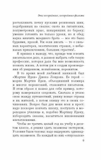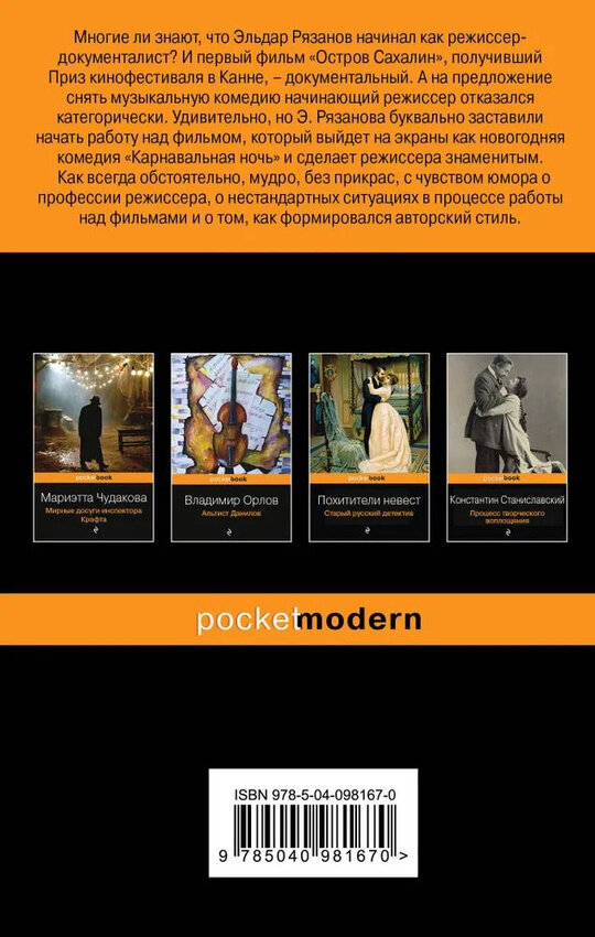 Фильмы Эльдара Рязанова - составная часть нашего культурного кода, его стихи также широко известны, особенно те, которые вплетены в фильмы. И эта небольшая книга прозы Эльдара Александровича, безусловно, уникальная возможность взглянуть глазами самого мастера на галерею его великолепных фильмов. Автор рассказывает о рождении кинокартин, о сценариях и артистах, о нюансах съёмки и режиссуры и о самой сущности кинематографии. Но самое главное - о себе, о творчестве и философии своего кино. "Я понял, что комедия - искусство снайперское, что приблизительность режиссёрского решения обязательно скажется на реакции зала - смеха не будет". Умная, оригинальная, интереснейшая проза.