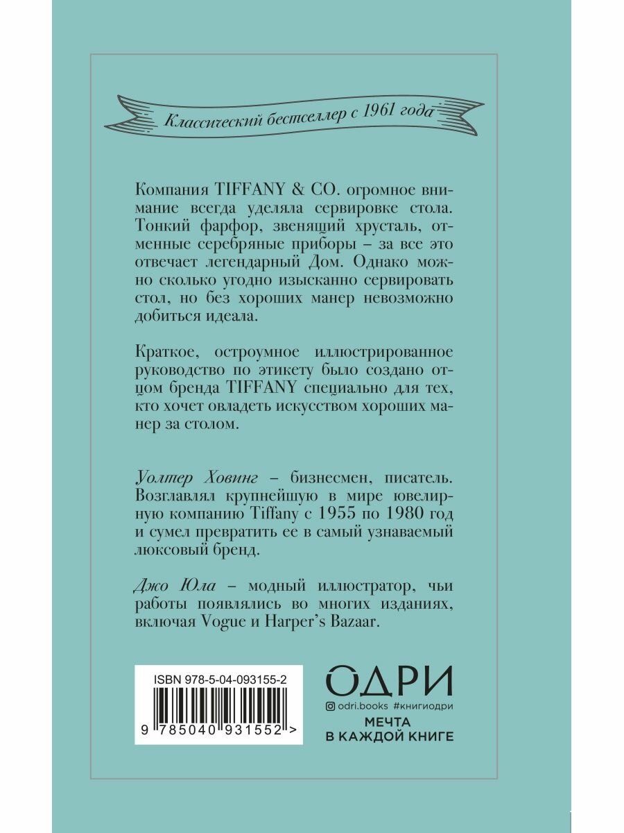 Краткое, остроумное иллюстрированное руководство по этикету было создано отцом бренда TIFFANY специально для тех, кто хочет овладеть искусством хороших манер за столом. Компания Tiffany & Co. огромное внимание всегда уделяла сервировке стола. Тонкий фарфор, звенящий хрусталь, отменные серебряные приборы – за все это отвечает легендарный Дом. Однако можно сколько угодно изысканно сервировать стол, но без хороших манер невозможно добиться идеала.