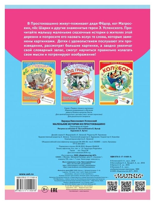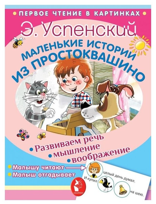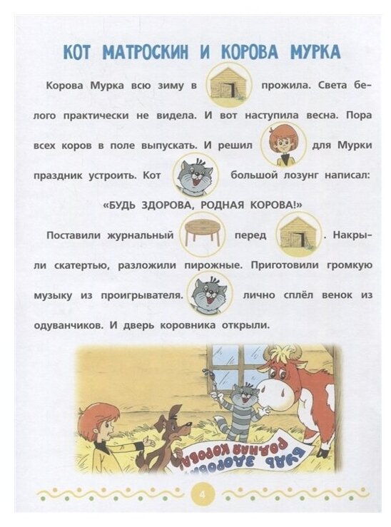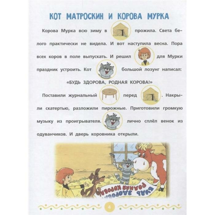 Книга с 4мя историями - продолжением классического Простоквашино. Некоторые слова заменены картинками, книгу можно использовать при тренировке чтения только научившегося читать ребенка. Поэтому книга подойдет не только малышам , но и деткам 5-6 лет, как тренажер для чтения. Тексты простые, шрифт «жирный» и понятный.