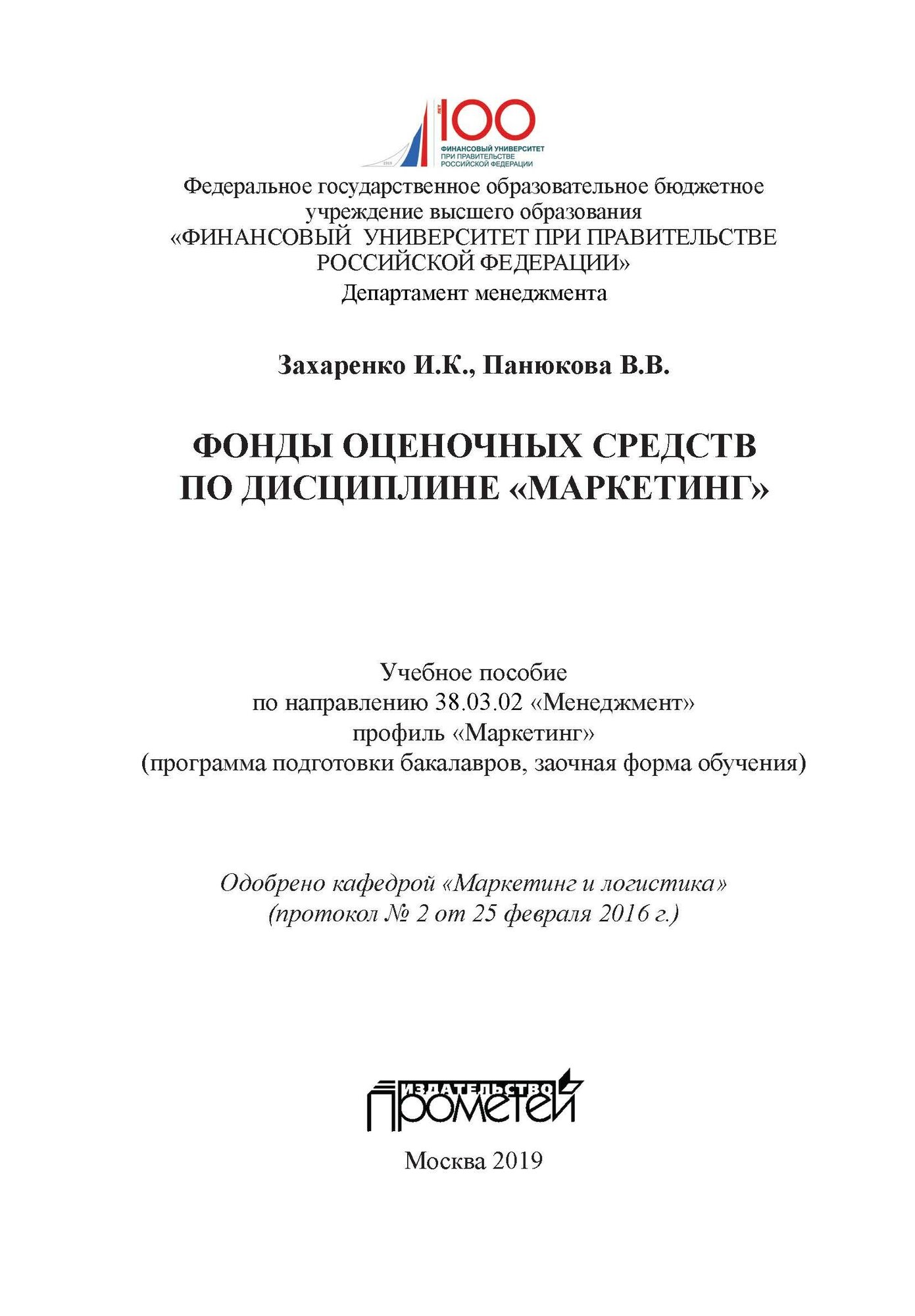 Фонды оценочных средств по дисциплине "Маркетинг". Учебное пособие для студентов обучающихся по направлению 38.03.02 "Менеджмент" профиль "Маркетинг" (программа подготовки бакалавров заочная форма о (Панюкова Вероника Васильевна, Захаренко Ирина Киримовна); Прометей, 2019