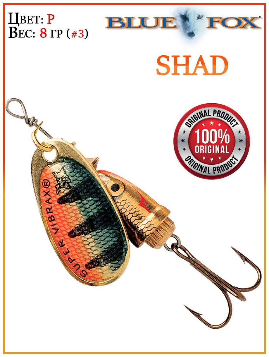 Блесна вращающаясяающаяся BLUE FOX Shad 3 /P / 8гр Благодаря своей конструкции блесна Blue Fox Vibrax Shad гарантирует точный, четкий и лаконичный заброс. Данное преимущество по достоинству оценят особые любители интенсивного джиггинга и ловкого твиччинга. Способ воздействия на рыбу, который включает в себя не только способность динамично двигаться и дарить блики света, но также издавать звуки во время проводки, великолепным образом активизирует будущий трофей. Блесна Blue Fox Vibrax Shad выполнена из прочного и долговечного латунного сплава, который создает оптимальную массу приманке для выполнения силового заброса. Корпус в форме колокола с заостренным носом создает потрясающую визуальную имитацию натуральной добычи, что очень привлекательно для рыбы. Кроме того, 'колокол' задает дополнительные колебания, которые заметны для самого осторожного и притаившегося хищника. Для защиты удилища от скручивания лески, происходящего обычно в водоемах с сильным течением и насыщенных растительностью, корпус блесны Blue Fox Vibrax Shad оснащен специальной втулкой. Она позволяет избежать скручивания, тем самым не вызывая лишних движений при ловле трофея.