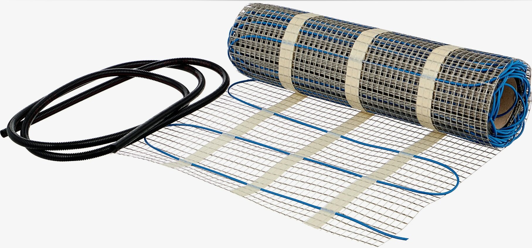 Упаковка включает нагревательный мат, алюминиевую клейкую ленту, гофрированную трубку для установки датчика температуры пола