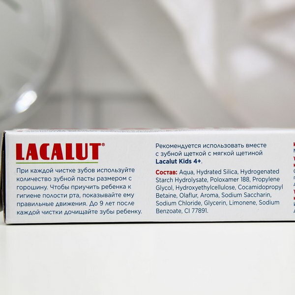 | Полное описание | Lacalut Baby (от 0 до 4 лет) - детская зубная паста для молочных зубов. Без сахара, с витаминами А и Е. Малиновый вкус. Безопасна при случайном проглатывании. Начинать ухаживать за зубами нужно с момента их появления, поскольку от состояния молочных зубов зависит нормальное формирование постоянных зубов и челюстных костей. Состав: паста Lacalut Baby содержит практически те же компоненты, что и взрослые пасты Lacalut, только в пропорциях, безопасных для детей. Например, вместо простого, но очень активного фтора в состав Lacalut Baby входит более щадящее для детских зубов, но не менее действенное соединение - аминофторид. В пасте в 6 раз меньше фтора (250 ppm) и поэтому она абсолютно безопасна при случайном проглатывании. Способ применения: Чистить зубы минимум 2 раза в день на протяжении не менее 3-х минут. Объем |