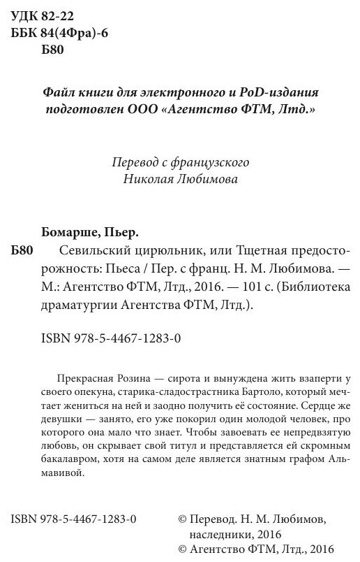 На сегодняшний день товар «Книга: Севильский цирюльник или Тщетная предосторожность (Пьер Бомарше); ФТМ, 1775» можно купить с кешбеком в 2 магазинах: ЛитРес, Яндекс.Маркет