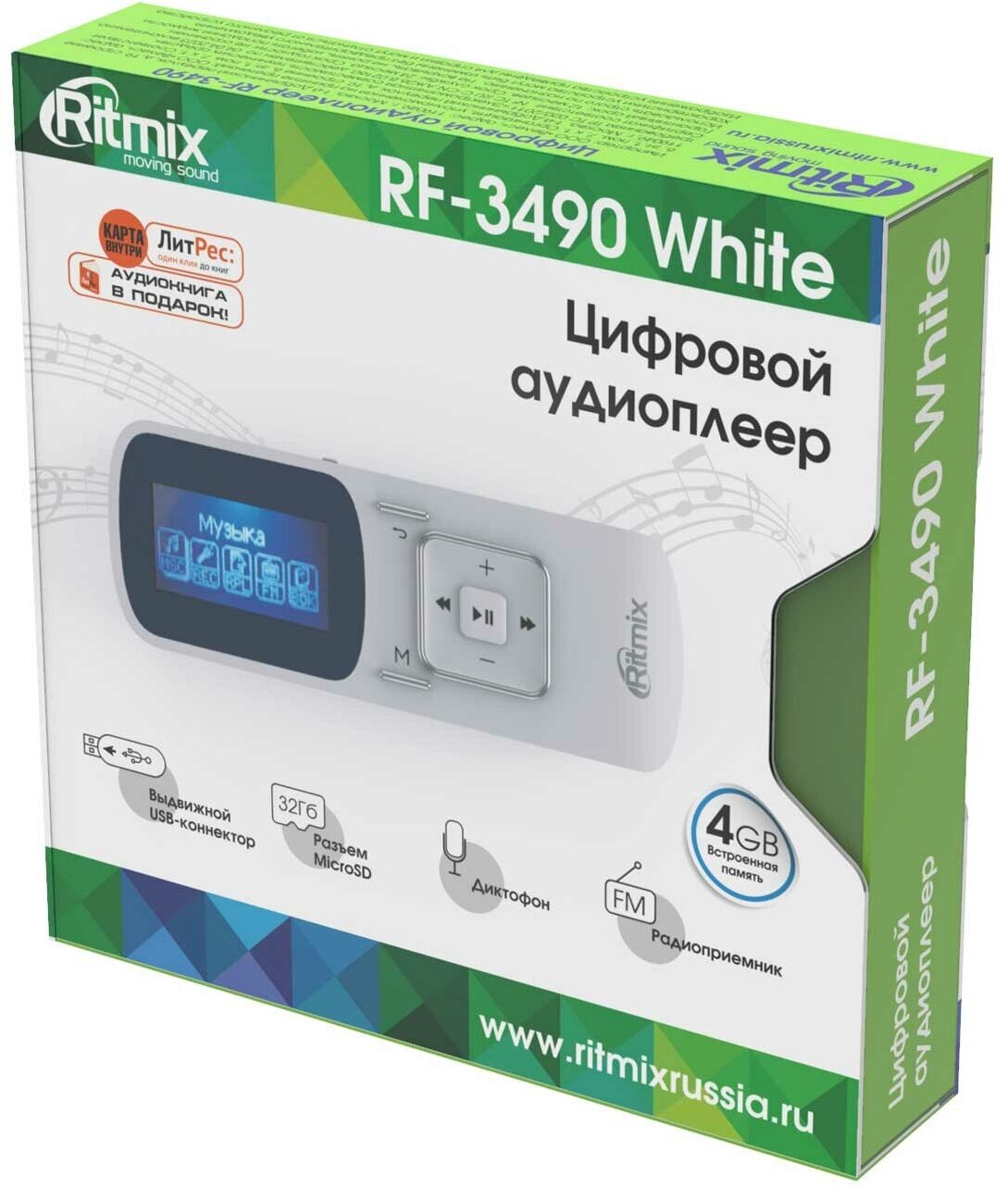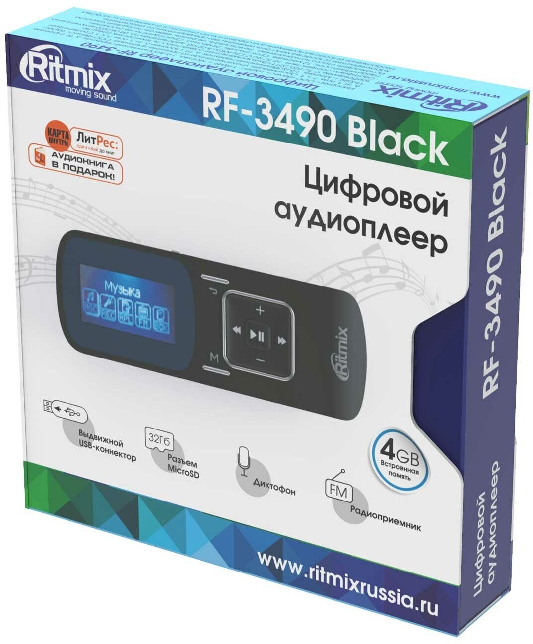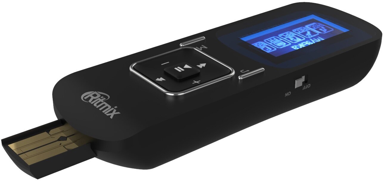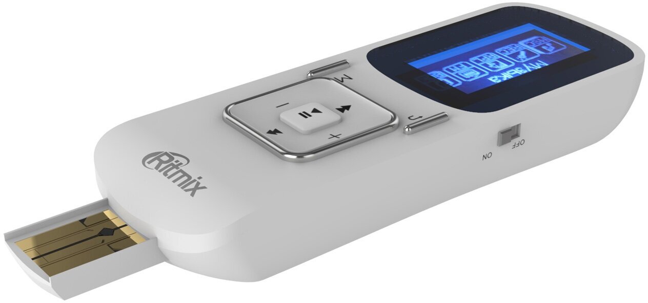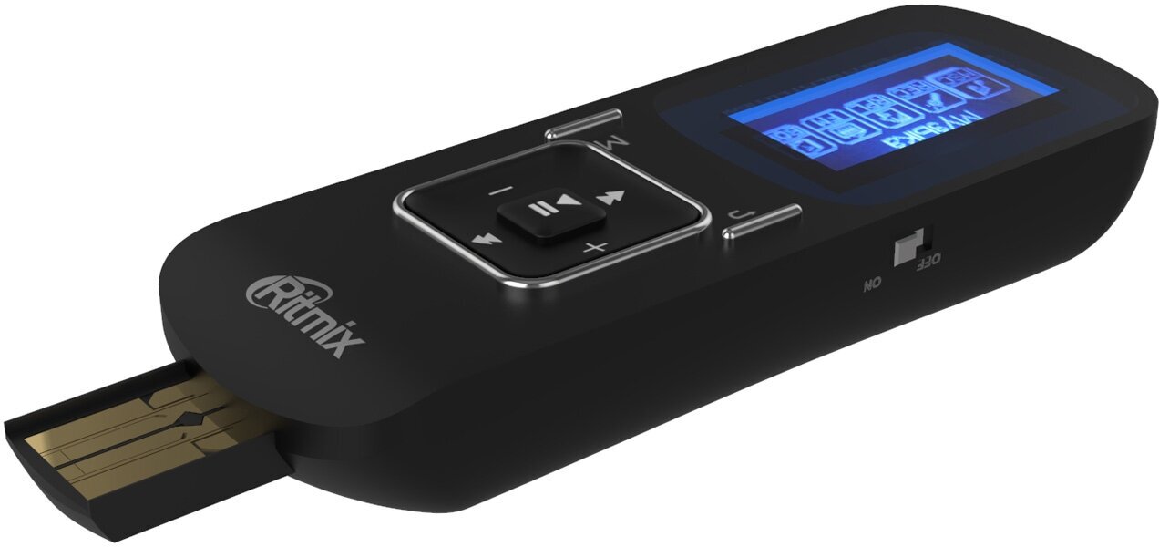 Ritmix RF-3490 - компактный аудиоплеер, выполненный в формфакторе флэшки - коннектор под крышкой обеспечивает прямое подключение к компьютеру. Устройство оснащено однодюймовым дисплеем, на который выводятся названия трэков и содержимое текстовых файлов. Имеются встроенные диктофон, радио и слот для карт памяти.