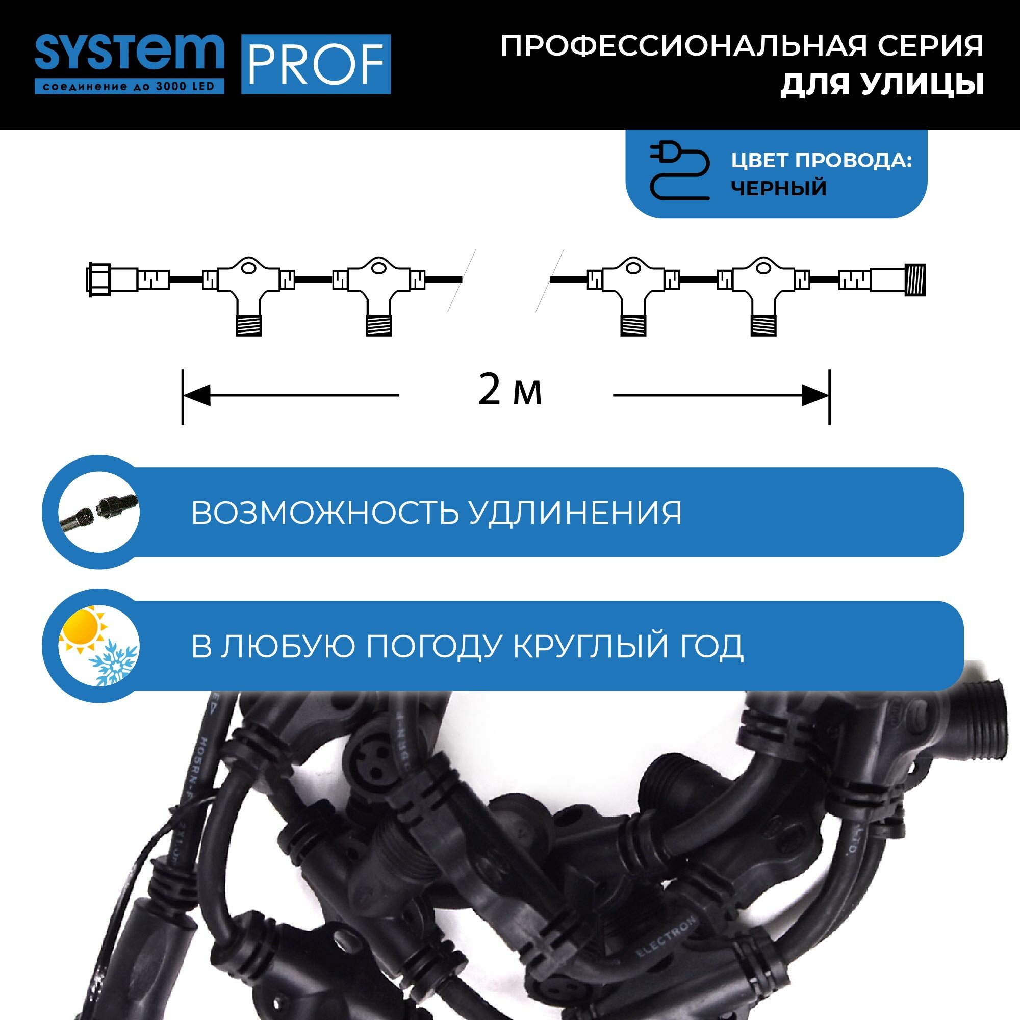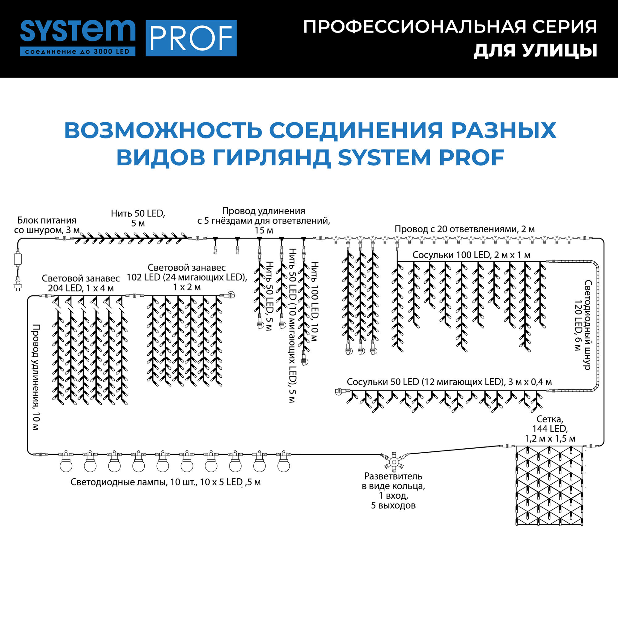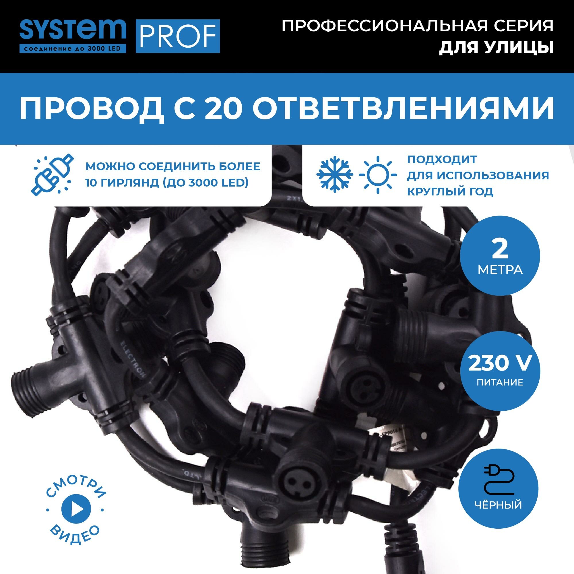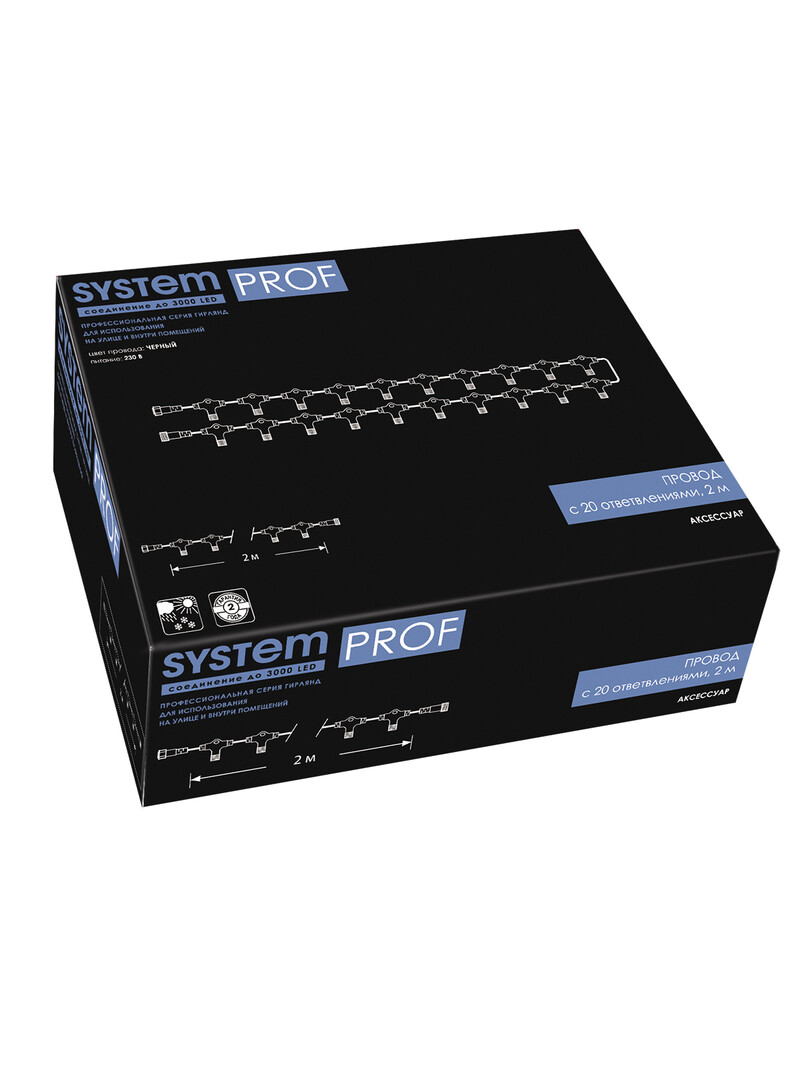 Ниспадающие, словно потоки воды, разноцветные сверкающие нити - словно двери в настоящую сказку. Откройте для себя свою Нарнию и создайте необычную, волшебную завесу при помощи провода System Prof. Простая и удобная конструкция позволяет крепить к основанию различные по длине и цвету гирлянды (не более 20). Комбинируйте разные цветовые решения, создавайте необычные световые занавесы для наружного и внутреннего светового декора вместе с продукцией серии System Prof. Провод System Prof черного цвета, длиной 2 м. Предназначен для создания световых занавесов различной конфигурации. Имеет 20 выходов для подключения светодиодных гирлянд общей численностью до 3000 лампочек. Серия профессиональных гирлянд и аксессуаров System Prof отличается высоким качеством и безопасностью эксплуатации. Все изделия подходят для наружного и внутреннего использования. Гирлянды можно комбинировать и соединять в различные световые варианты оформления - все ограничивается только вашей фантазией! Достоинства и преимущества - провод изготовлен из прочных и качественных материалов - устойчив к различным внешним воздействиям - гарантирует безопасность работы световой конструкции - позволяет подключать до 20 гирлянд Области применения Провод System Prof подходит для использования внутри помещений и на улице. С его помощью можно формировать оригинальные световые занавесы, которые подходят для оформления окон, витрин, арок, проемов, беседок и других конструкций.