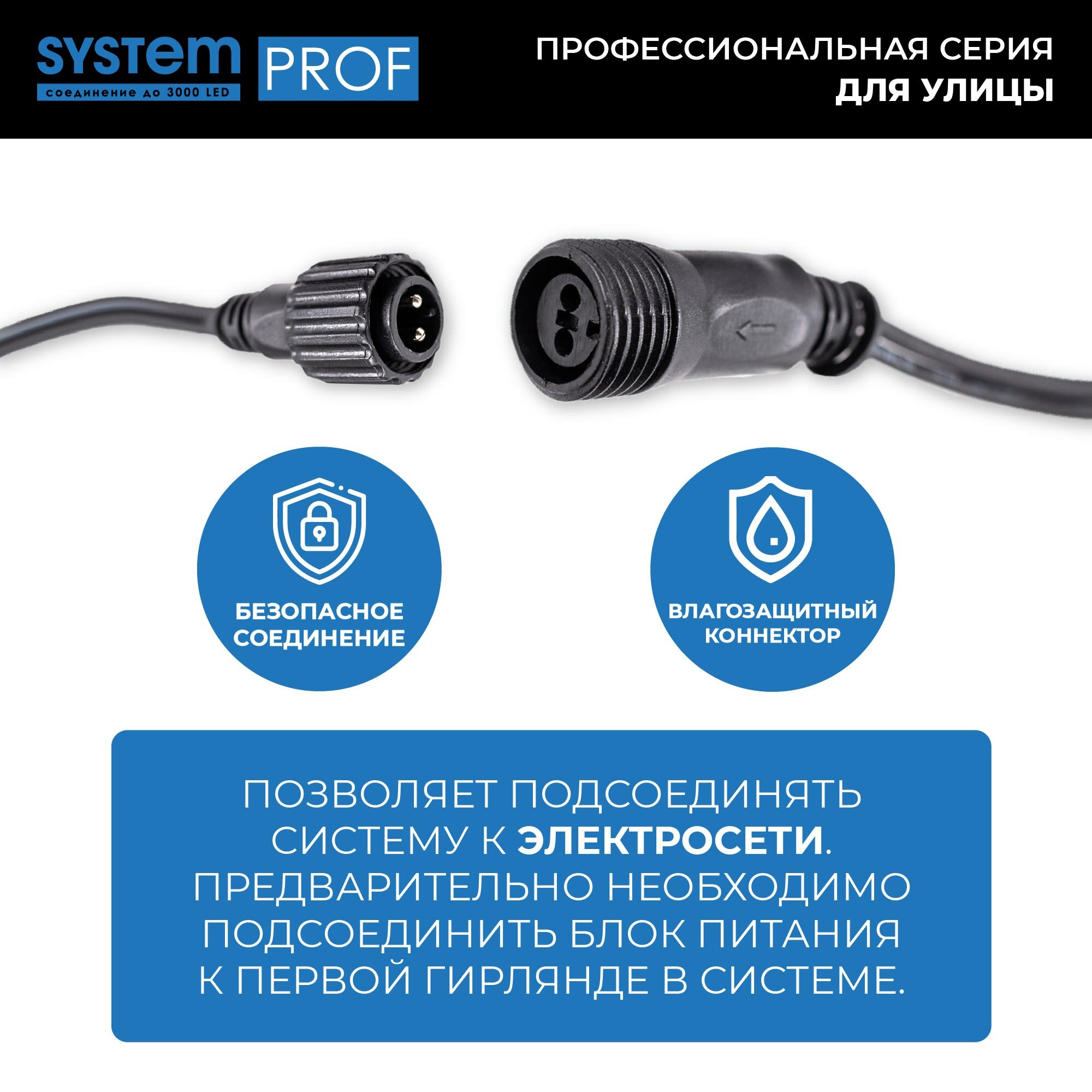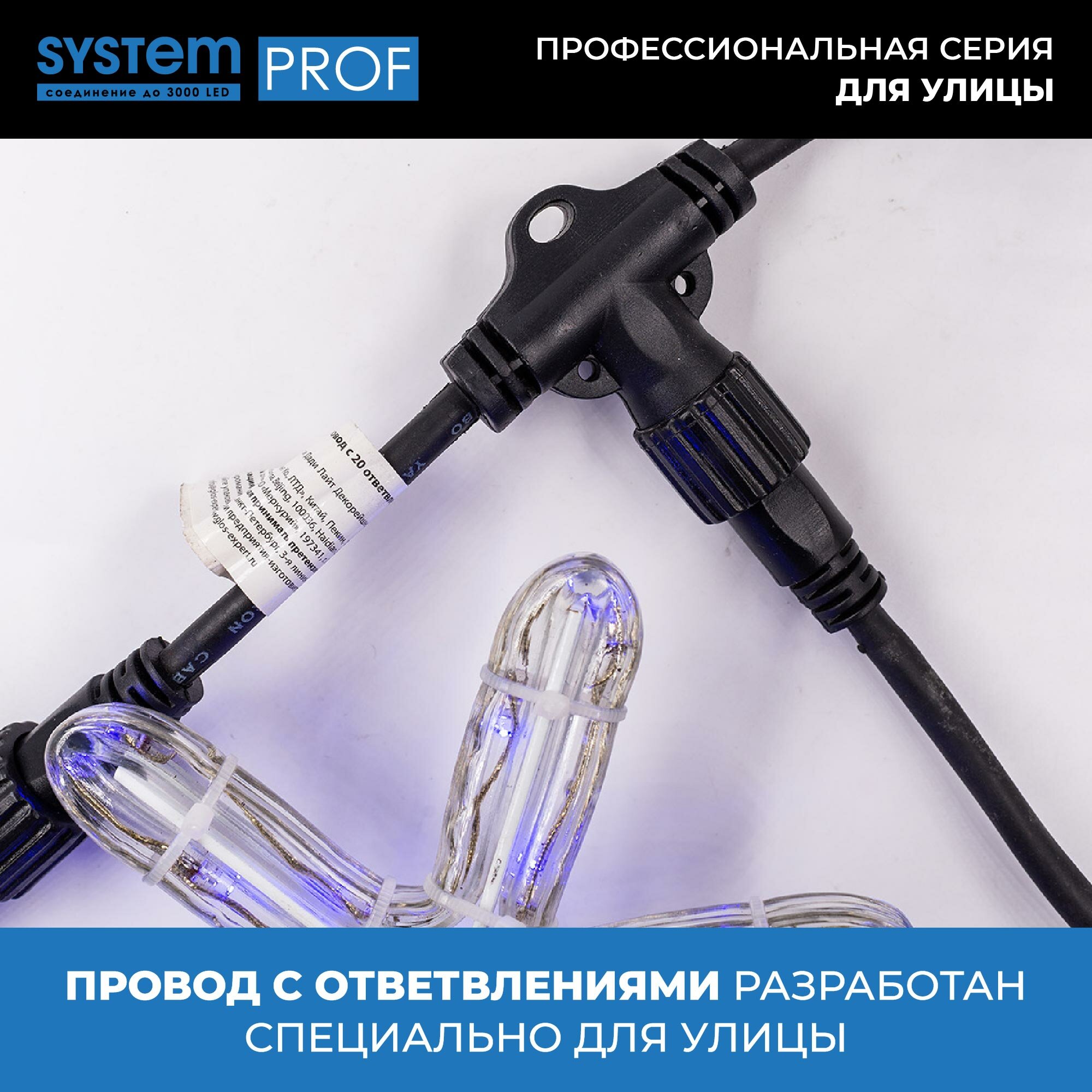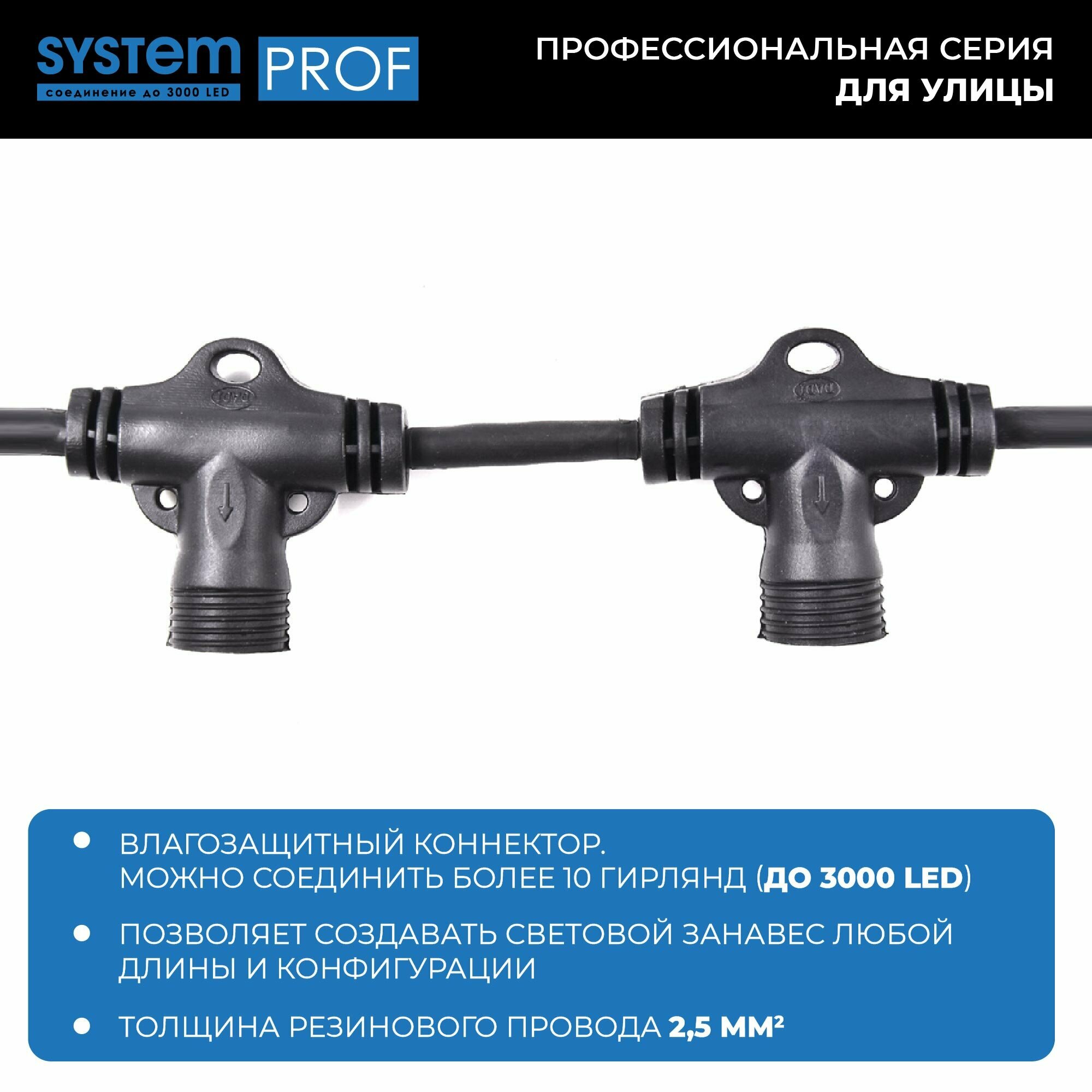 Ниспадающие, словно потоки воды, разноцветные сверкающие нити - словно двери в настоящую сказку. Откройте для себя свою Нарнию и создайте необычную, волшебную завесу при помощи провода System Prof. Простая и удобная конструкция позволяет крепить к основанию различные по длине и цвету гирлянды (не более 20). Комбинируйте разные цветовые решения, создавайте необычные световые занавесы для наружного и внутреннего светового декора вместе с продукцией серии System Prof. Провод System Prof черного цвета, длиной 2 м. Предназначен для создания световых занавесов различной конфигурации. Имеет 20 выходов для подключения светодиодных гирлянд общей численностью до 3000 лампочек. Серия профессиональных гирлянд и аксессуаров System Prof отличается высоким качеством и безопасностью эксплуатации. Все изделия подходят для наружного и внутреннего использования. Гирлянды можно комбинировать и соединять в различные световые варианты оформления - все ограничивается только вашей фантазией! Достоинства и преимущества - провод изготовлен из прочных и качественных материалов - устойчив к различным внешним воздействиям - гарантирует безопасность работы световой конструкции - позволяет подключать до 20 гирлянд Области применения Провод System Prof подходит для использования внутри помещений и на улице. С его помощью можно формировать оригинальные световые занавесы, которые подходят для оформления окон, витрин, арок, проемов, беседок и других конструкций.