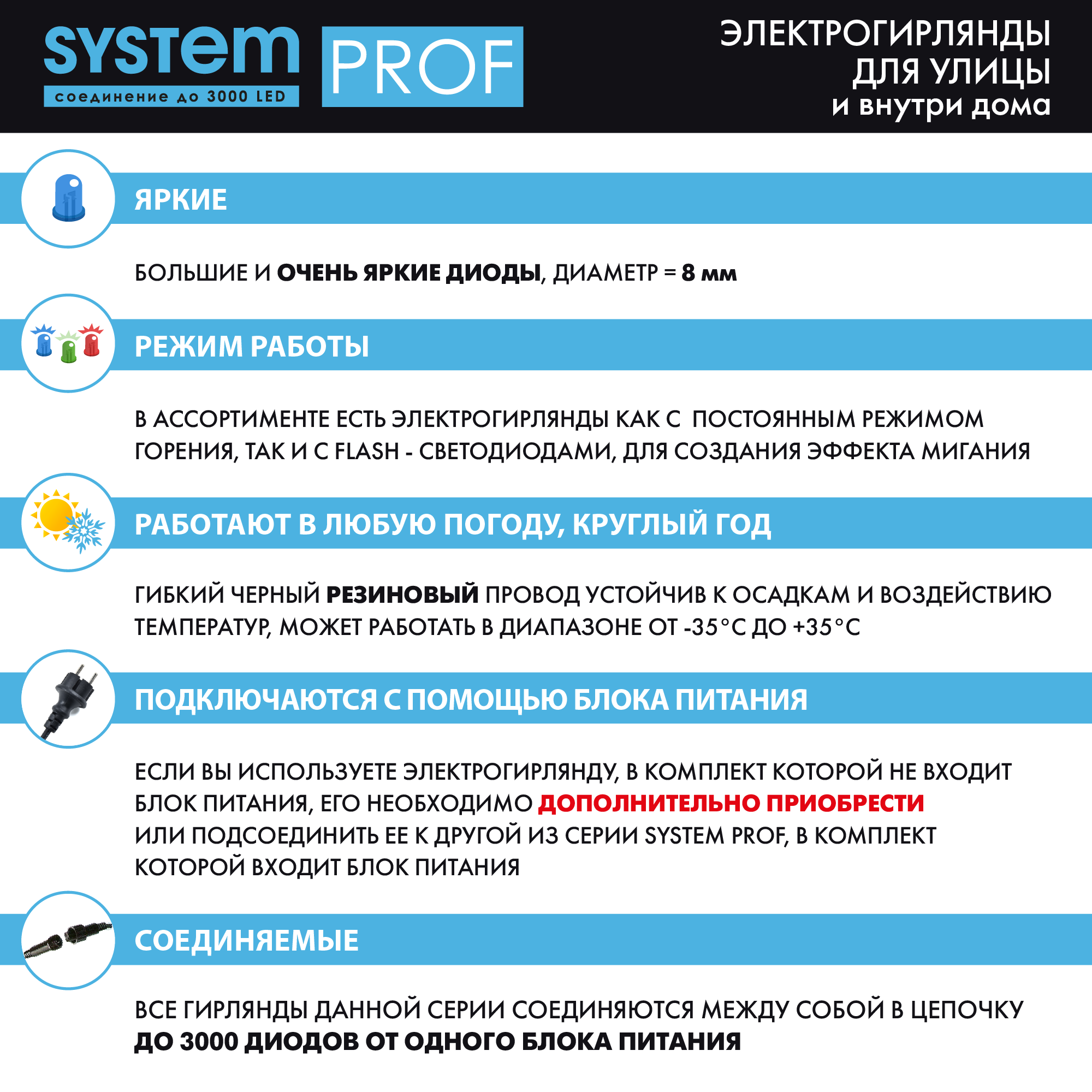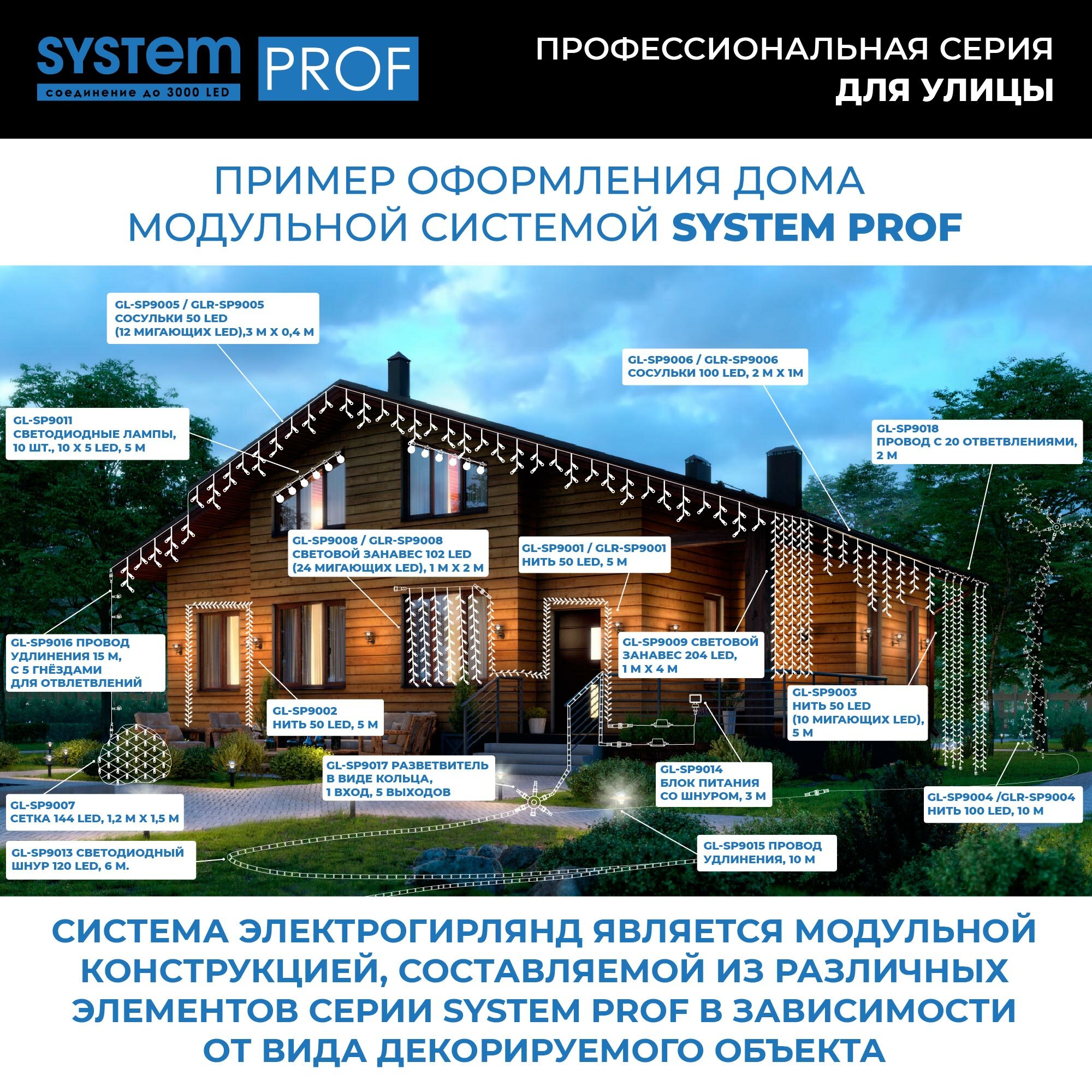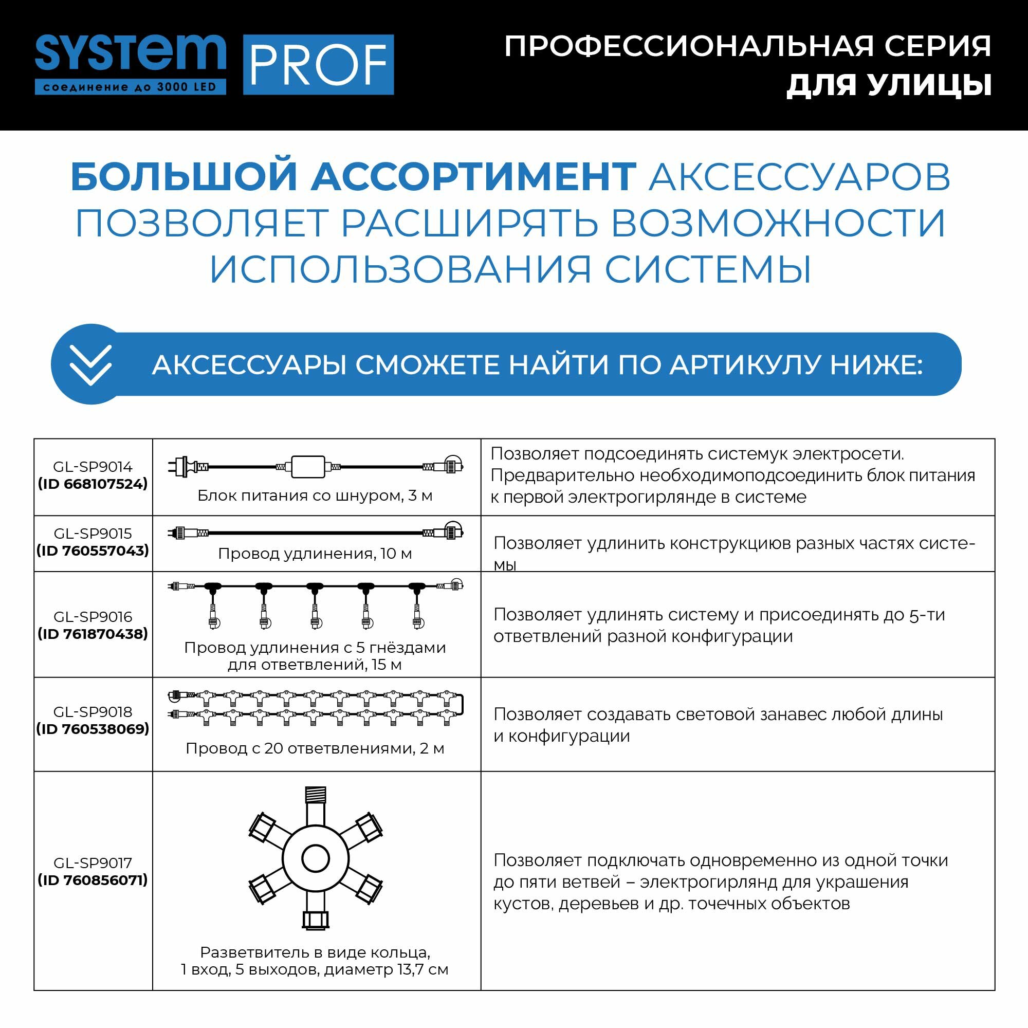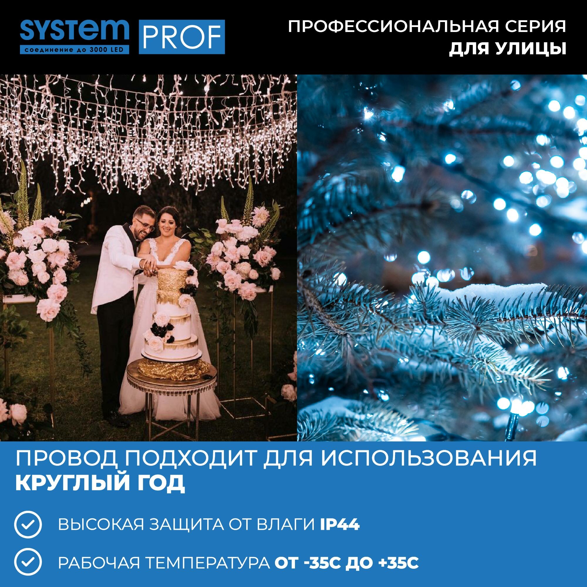 Ниспадающие, словно потоки воды, разноцветные сверкающие нити - словно двери в настоящую сказку. Откройте для себя свою Нарнию и создайте необычную, волшебную завесу при помощи провода System Prof. Простая и удобная конструкция позволяет крепить к основанию различные по длине и цвету гирлянды (не более 20). Комбинируйте разные цветовые решения, создавайте необычные световые занавесы для наружного и внутреннего светового декора вместе с продукцией серии System Prof. Провод System Prof черного цвета, длиной 2 м. Предназначен для создания световых занавесов различной конфигурации. Имеет 20 выходов для подключения светодиодных гирлянд общей численностью до 3000 лампочек. Серия профессиональных гирлянд и аксессуаров System Prof отличается высоким качеством и безопасностью эксплуатации. Все изделия подходят для наружного и внутреннего использования. Гирлянды можно комбинировать и соединять в различные световые варианты оформления - все ограничивается только вашей фантазией! Достоинства и преимущества - провод изготовлен из прочных и качественных материалов - устойчив к различным внешним воздействиям - гарантирует безопасность работы световой конструкции - позволяет подключать до 20 гирлянд Области применения Провод System Prof подходит для использования внутри помещений и на улице. С его помощью можно формировать оригинальные световые занавесы, которые подходят для оформления окон, витрин, арок, проемов, беседок и других конструкций.