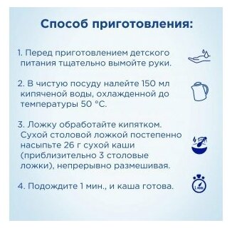 Проконсультируйтесь со специалистом перед началом использования продукта. Для детского питания. Рекомендуется готовить кашу непосредственно перед употреблением. Никогда не используйте остатки готового питания для последующего кормления. При введении прикорма рекомендуется приучать ребенка есть его с ложечки. После каждого приготовления питания тщательно закрывайте упаковку. Не допускается назначать детям, имеющим аллергию на любой компонент, входящий в состав продукта.