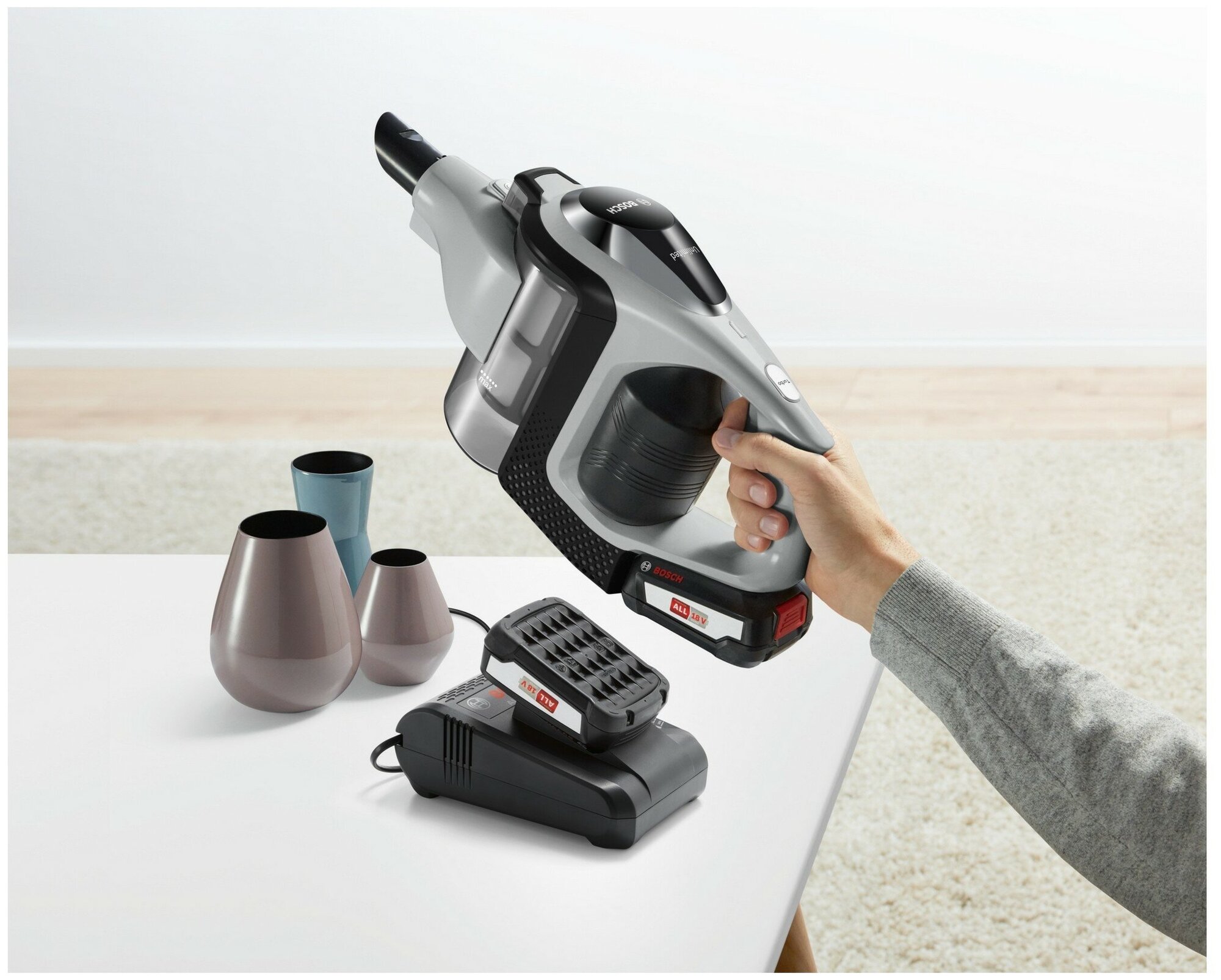 Пылесос серии Bosch Unlimited – это беспроводной пылесос, способный работать практически непрерывно благодаря сменным аккумуляторам и быстрой зарядке. Пока используется одна батарея, вторая заряжается. Это будет очень кстати, если вы хотите поддерживать в доме постоянную чистоту. система Bosch Power For ALL У большинства устройств разные аккумуляторы, что часто не очень удобно. 18-вольтовая система Power for All: блок аккумулятора пылесоса подходит также для электроинструментов Bosch для дома и сада.
