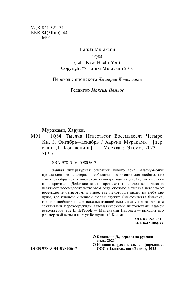 1Q84. Тысяча Невестьсот Восемьдесят Четыре. Книга 3. Октябрь-декабрь (Коваленин Дмитрий Викторович (переводчик), Мураками Харуки); Эксмо, 2022