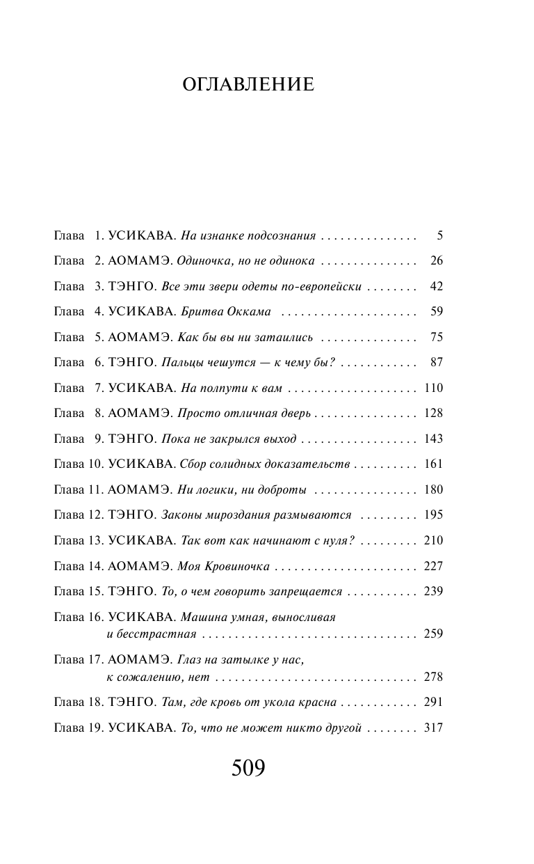 Второстепенные героя так же великолепны. Нет ни одного повторяющегося персонажа! Каждый наделен своей особенностью: молчаливая 17-летняя писательница Фукаэри с неземной красотой, безалаберный редактор журнала Комацу со склонностью к авантюризму, амбициозная аристократка Мадам со стремлением творить возмездие чужими руками и много других. Однако моим фаворитом по-прежнему является Тамару - телохранитель Мадам. Сколько всего автор вложил в этот образ! Его появление на страницах романа - праздник! Каждая фраза - афоризм, каждое действие - фундамент для будущего, каждое замечание - пророчество!
