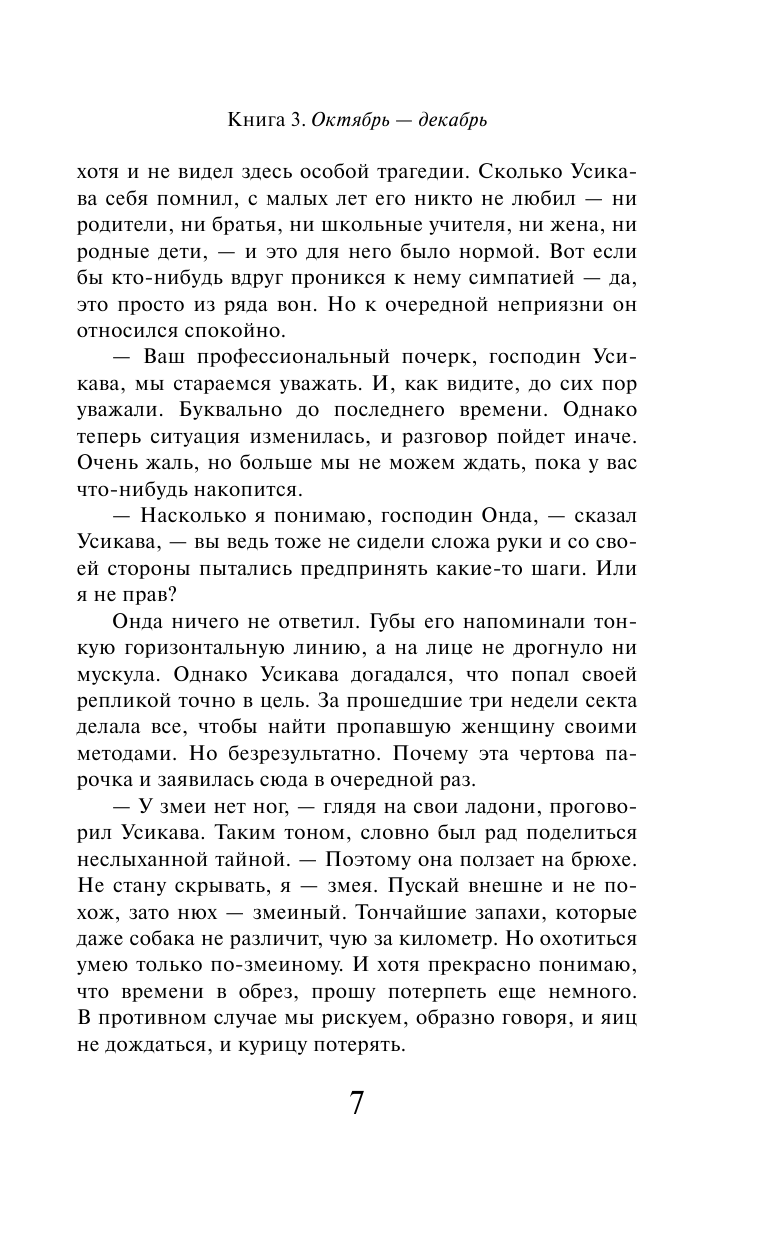 Итак, роман продолжается. Повествование третьей книги разделено на три линии. К линиям Аомамэ и Тэнго автор добавил сюжетную линию персонажа по имени Усикава. И это, не случайно! Огромная роль для него уготована в этой истории. Появившись в начале второй книги, его линия с каждой главой набирает обороты и является очень важным связующим звеном для двух других! Хочется отметить, как автор тонко переплел эти три нити повествования, которые чередуются между собой и каждая плавно дает продолжение другой, развивая сюжет. Благодаря такому повествованию мы видим историю с трех ракурсов и это невероятно интересно. Проводя анализ романа в контексте трех книг, начинаешь понимать, какую невероятную работу проделал Мураками! Сколько информации пропустил через себя! Все вопросы, заданные в начале и по мере повествования, полностью раскрыты к финалу. И как умело он дает ответы...до мурашек по коже, до слез в глазах!