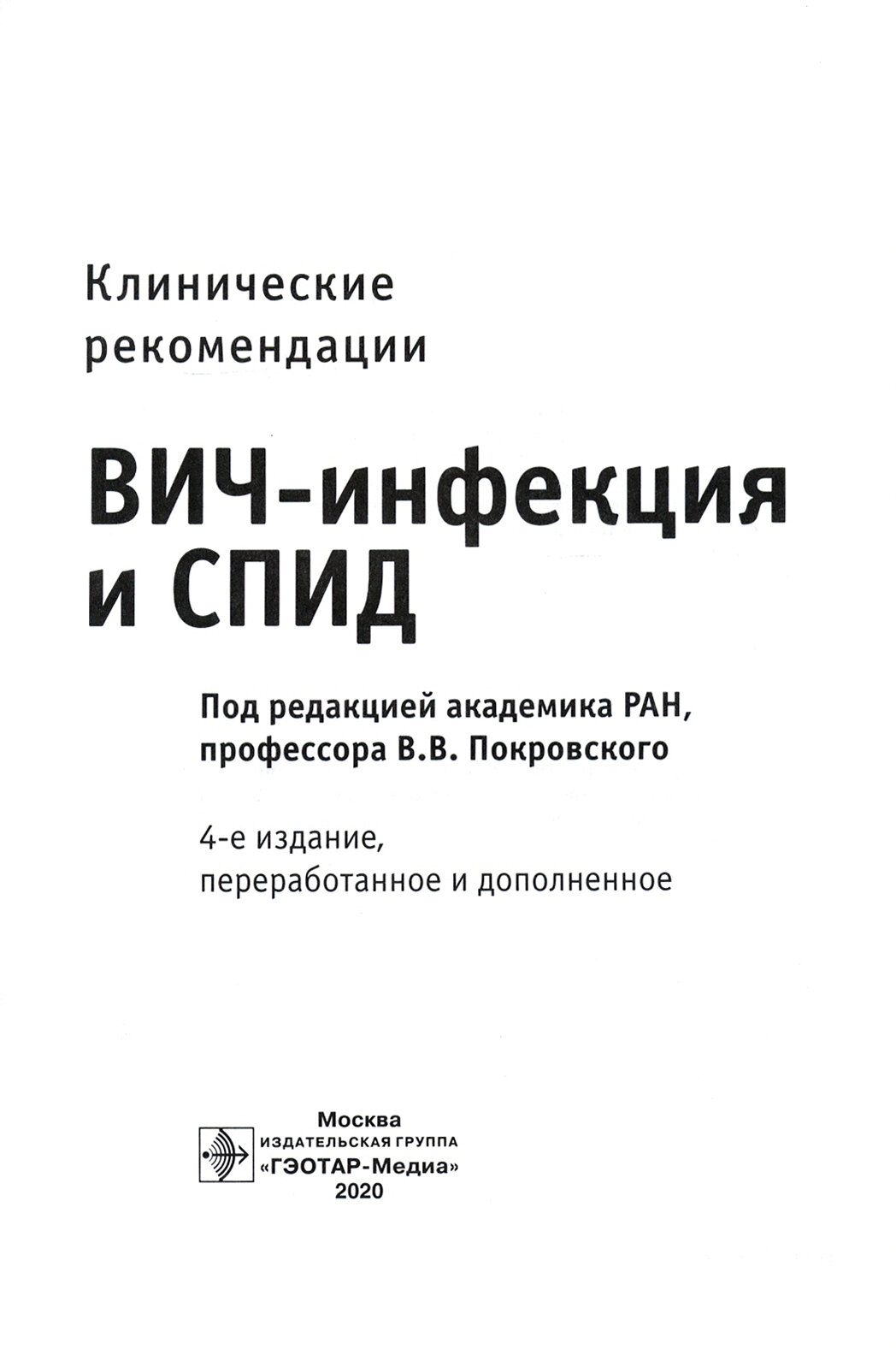 ВИЧ-инфекция и СПИД : клинические рекомендации (Покровский Вадим Валентинович, Зимина Вера Николаевна, Беляева Валентина Владимировна); ГЭОТАР-Медиа, 2020